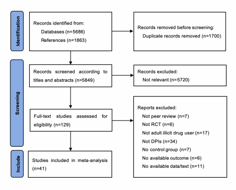 文献检索遵循PRISMA指南,在Web of Science、PubMed、PsycINFO、Embase和Cochrane对照试验注册库中检索截至⾄2025年8⽉27⽇发表的研究,并根据预定义标准筛选相关⽂献。纳⼊标准为:1)年龄在18岁及以上且有⾮法药物使⽤⾏为者。⾮法药物指⾮医疗或⾮科研⽬的使⽤的管制物质,包括但不限于⼤⿇、可卡因、苯丙胺和阿⽚类药物;2)数字社会⼼理⼲预是主要治疗⼿段。操作定义为主要通过数字平台提供的结构化⼼理⼲预,包括移动应⽤程序、基于⽹络的程序或数字通信⼯具,可伴有或不伴有最⼩程度的人工⽀持;3)⽂章报告样本量及/或脱落率;4)随机对照试验。经筛选最终纳⼊41项研究,共涉及9693名年龄在19⾄50岁之间的参与者。
