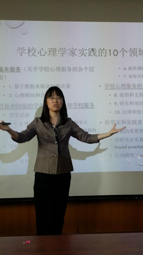 在熊俊梅老师的介绍后,倪虹副教授开始了她的讲座。倪虹副教授先就美国的学校心理学情况进行了简单介绍,然后介绍了儿童发展的风险因素和复原力研究,最终着重介绍了班级地图调查表和心理顾问服务的干预方法。讲座结束时,学生和倪虹副教授就讲座内容进行了热烈的讨论。最后,此次讲座在江光荣老师的主持总结中圆满结束。