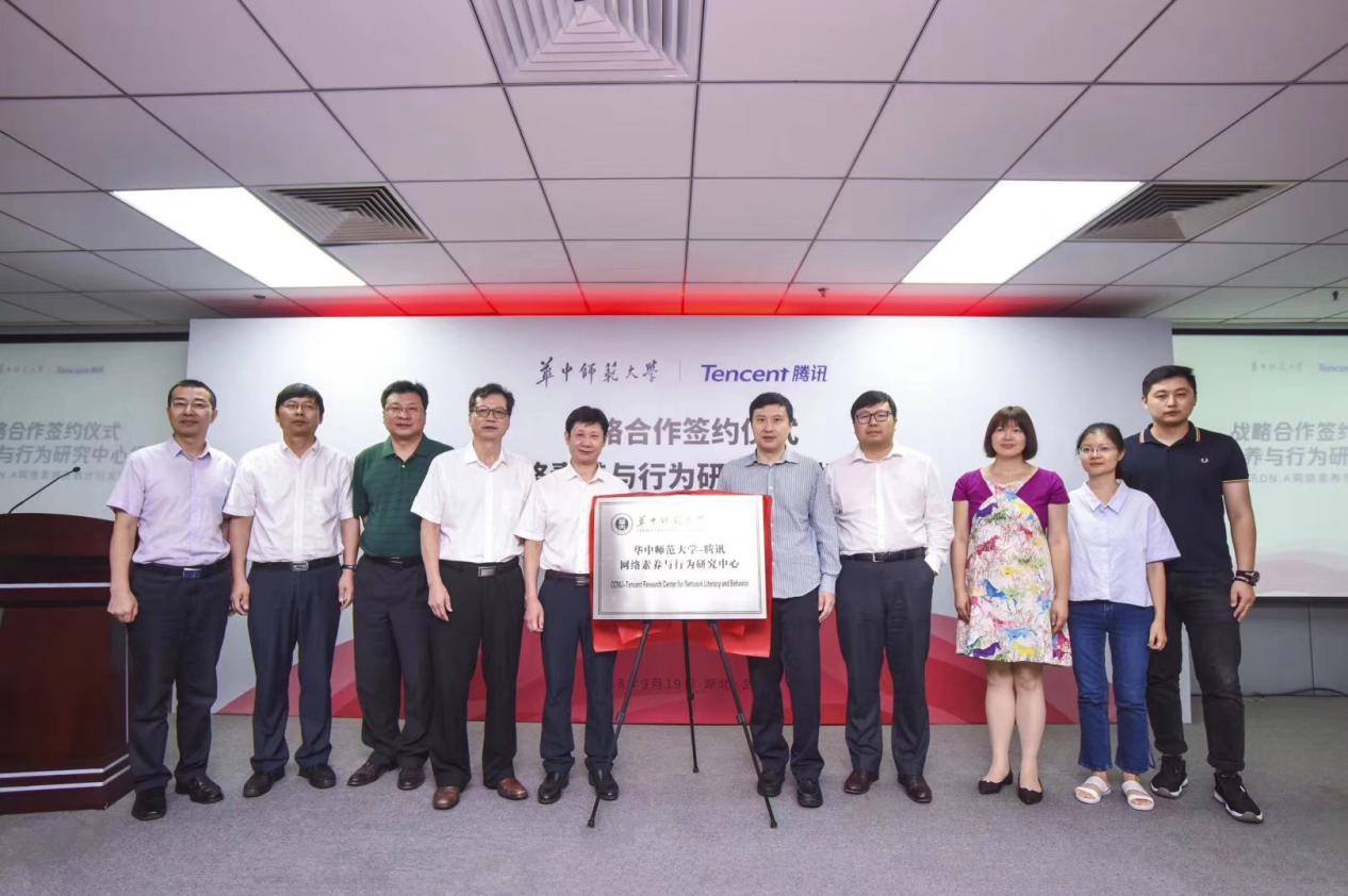 2018年9月19日上午,华中师范大学-腾讯战略合作协议签署暨网络素养与行为研究中心揭牌仪式在华中师范大学成功举行。华中师范大学校长,党委副书记赵凌云、副校长彭南生、湖北省委宣传部网络建设处处长刘世奎、湖北省教育厅科技处处长王强、腾讯副总裁姚晓光、社会研究中心主任岳淼、互联网与社会研究中心总监王晓冰、华中师范大学科研部部长杨亚东、青少年网络心理与行为教育部重点实验室主任周宗奎、常务副主任王伟军、实验室与设备管理处等单位的负责人出席了此次活动。此次活动由心理学院常务副院长马红宇主持。