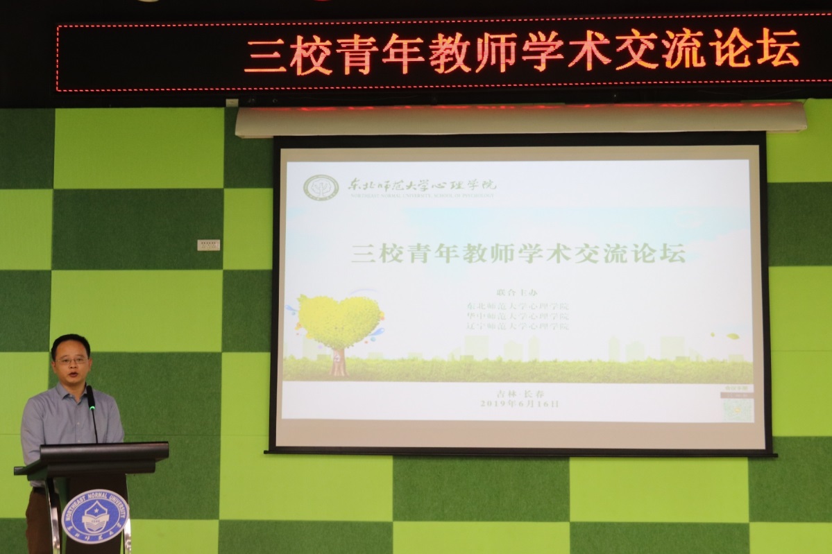 2019年6月16日,由华中师范大学心理学院、东北师范大学心理学院和辽宁师范大学心理学院联合举办的“三校青年教师学术论坛”在东北师范大学心理健康中心C12报告厅顺利召开。华中师范大学心理学院副院长孙晓军,东北师范大学心理学院院长盖笑松、副院长姜英杰和辽宁师范大学心理学院副院长孙岩,以及三校十余位优秀青年教师代表、心理学相关专业的学生代表参加了本次交流活动。本次论坛由现场报告和网上直播两种方式呈现。
