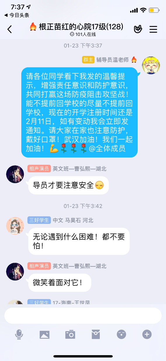 一是成立工作机构,明确工作责任。学院第一时间成立由党委书记、党委副书记、团委书记、研究生辅导员、本科生辅导员组成的学生防疫战疫工作小组,明确书记为研究生负责人,副书记为本科生负责人,各年级辅导员依照分管学生包干负责,重点做好防疫工作的前提下,组织动员学生广泛参与抗疫工作。同时,组建疫情防控工作微信群,搭建“封城”背景下的主要信息沟通交流平台。