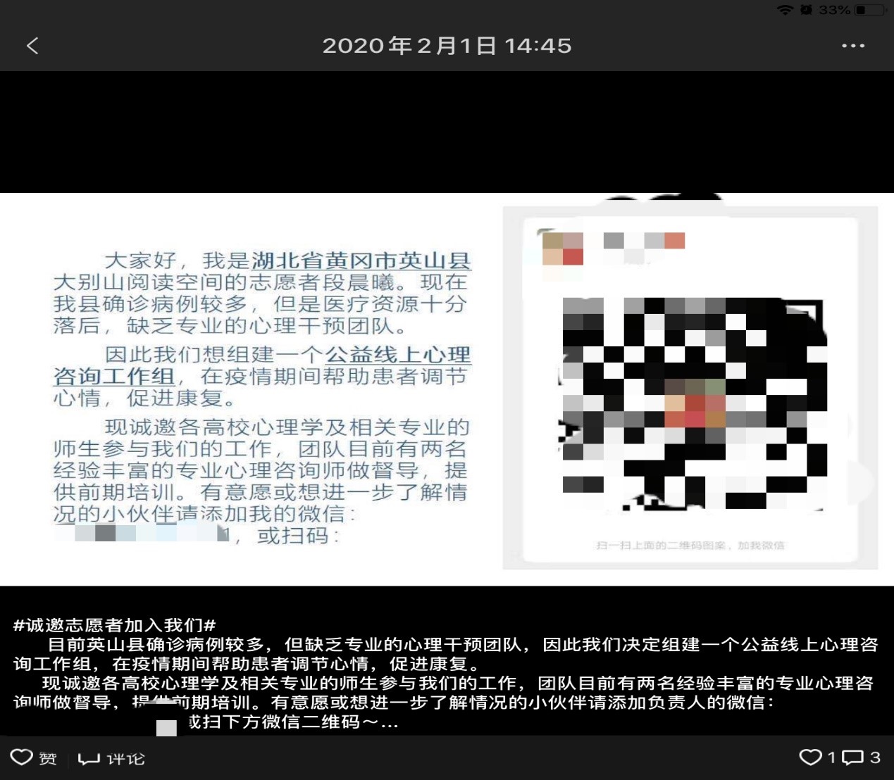 一是协同开展大众心理援助。针对广大师生和社会公众的紧张和焦虑情绪,心理学院迅速参与组建了一支心理援助支援服务队伍。研究生辅导员张婷身在外地,心系学校,通过各种途径面向在校生和校友发布招募通知,组织学生300余人参与心理援助热线,秉承以人为本、尊重生命、严谨专业、全力以赴的理念,传递爱心和信心。截至2月6日,共接待咨询近1500人次,该项工作被人民网、中国青年报等多家媒体报道。