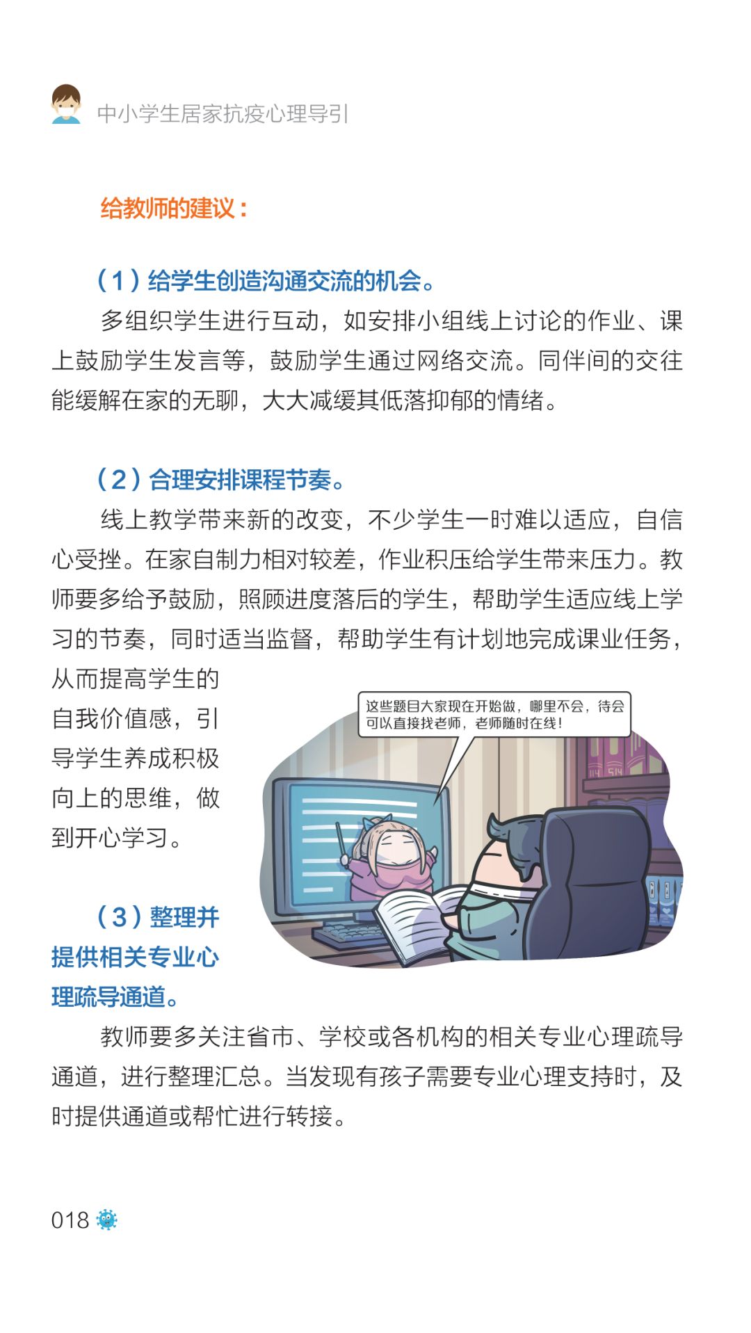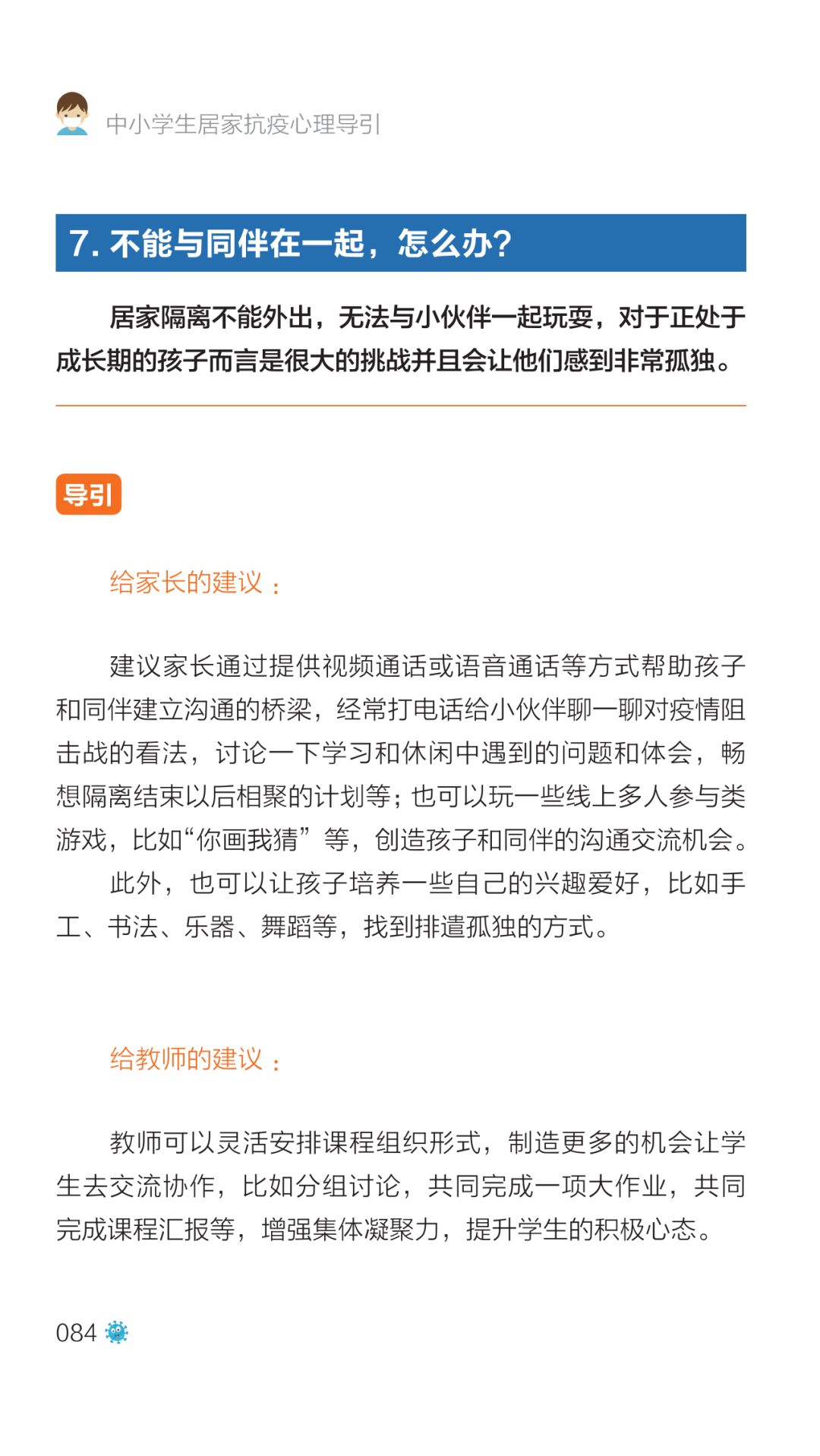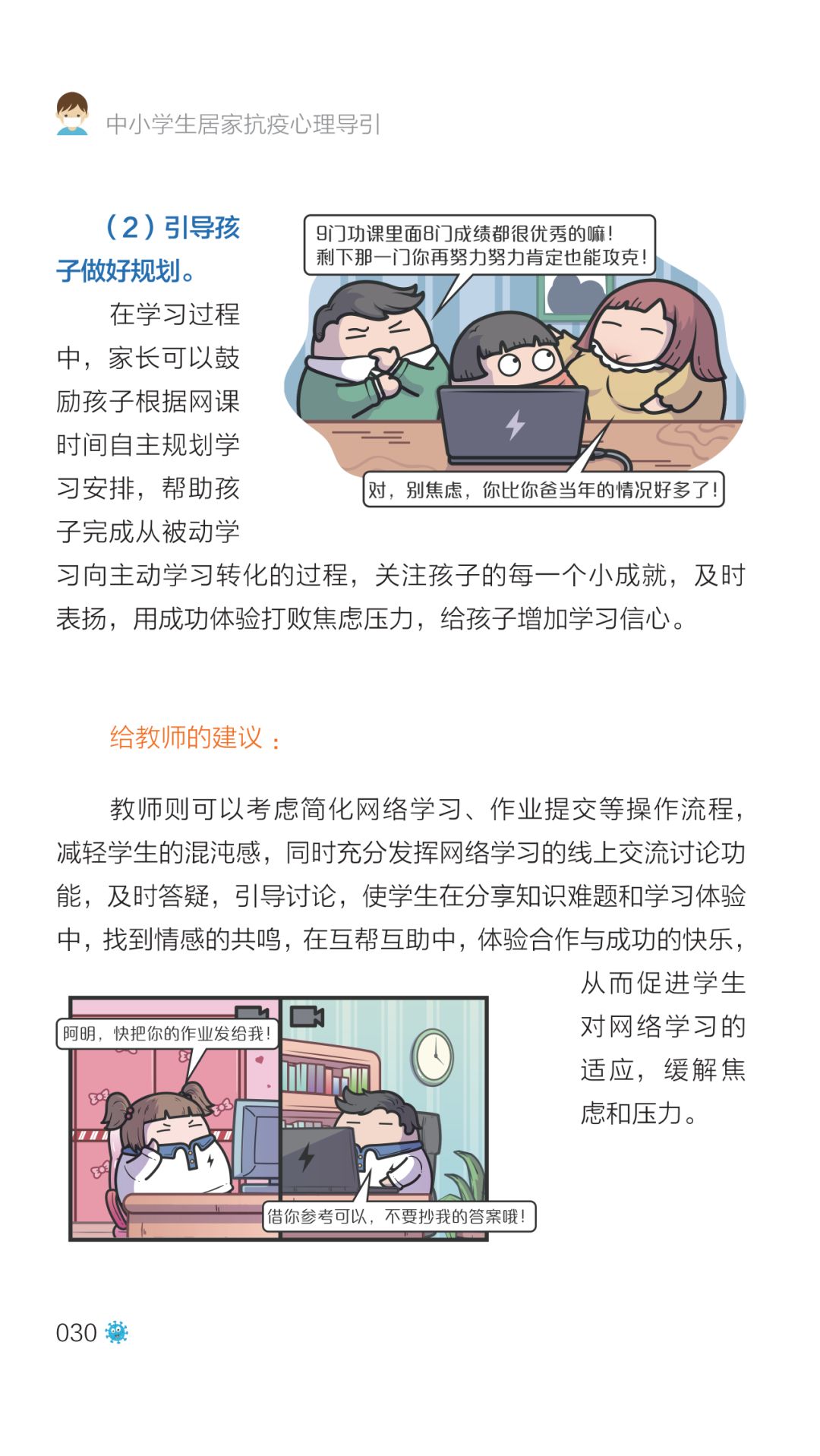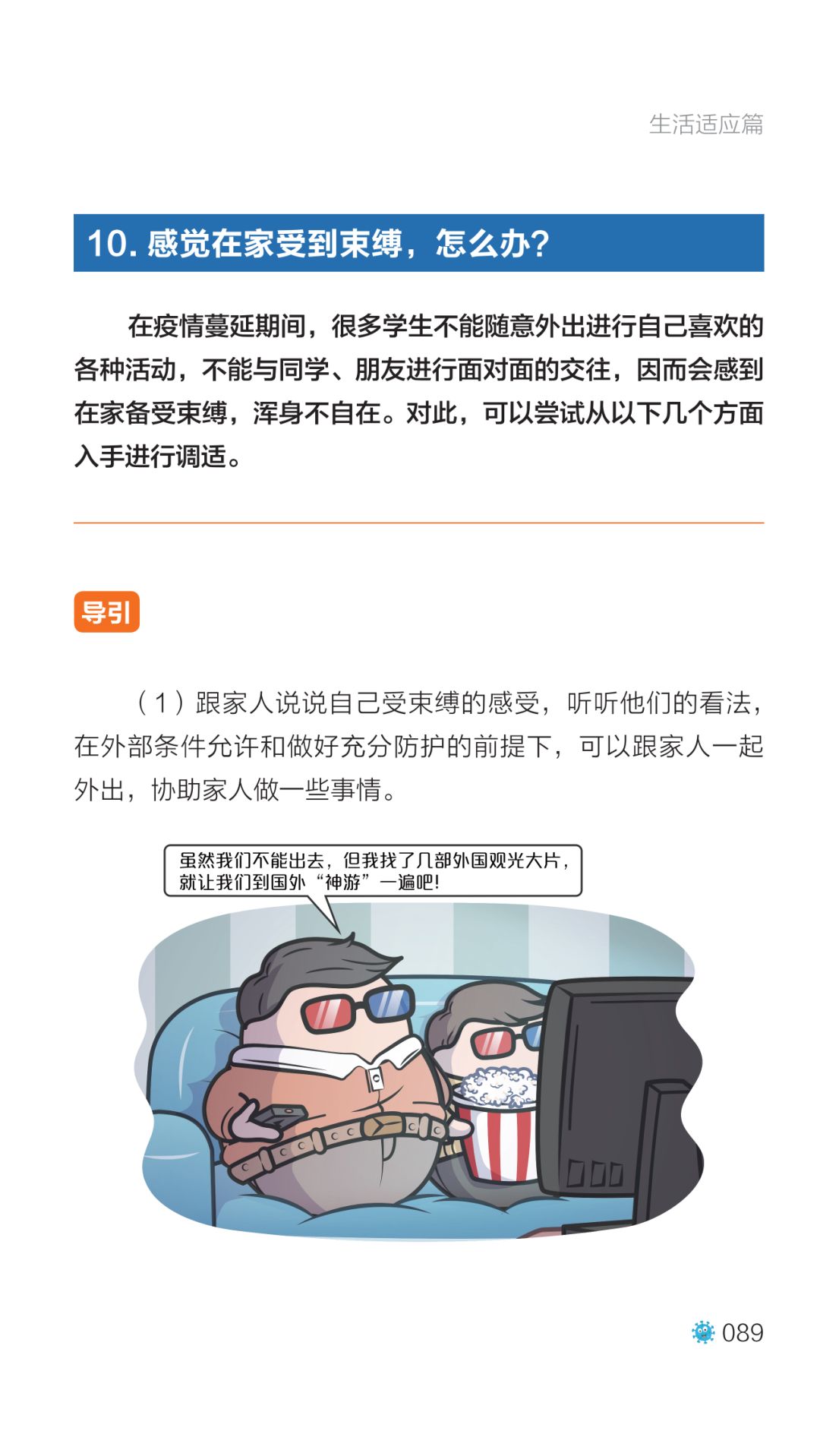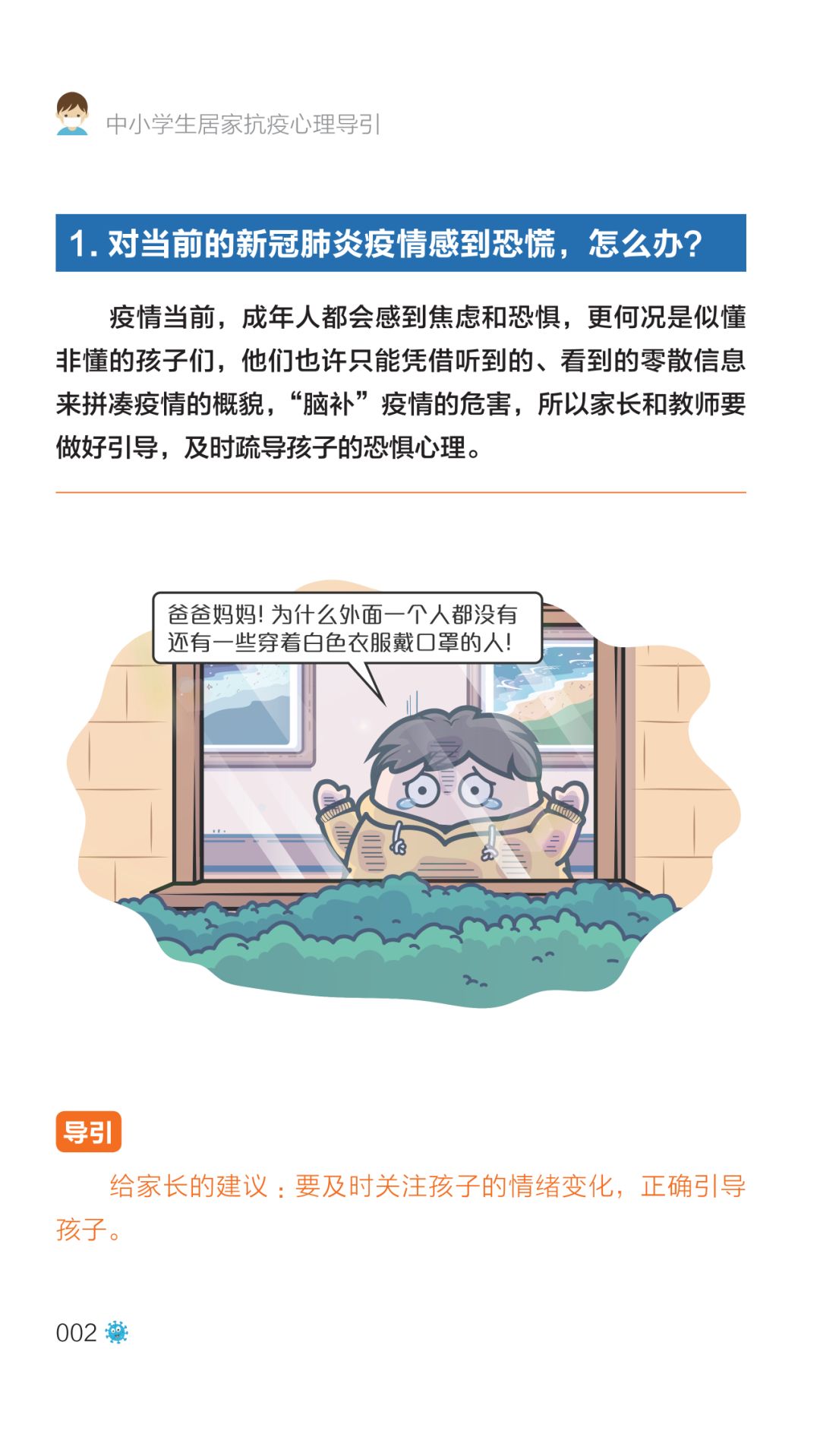 当他们面对大量有关疫情的信息无从分辨时,会感到恐惧和焦虑;当他们因疫情不得不长期居家难见朋友时,会感到拘束和烦闷;当他们因家人投入一线抗疫工作无法合家团圆时,会感到担忧和孤独;而在中小学全面开展在线教育时,他们更是面临着全新的挑战。