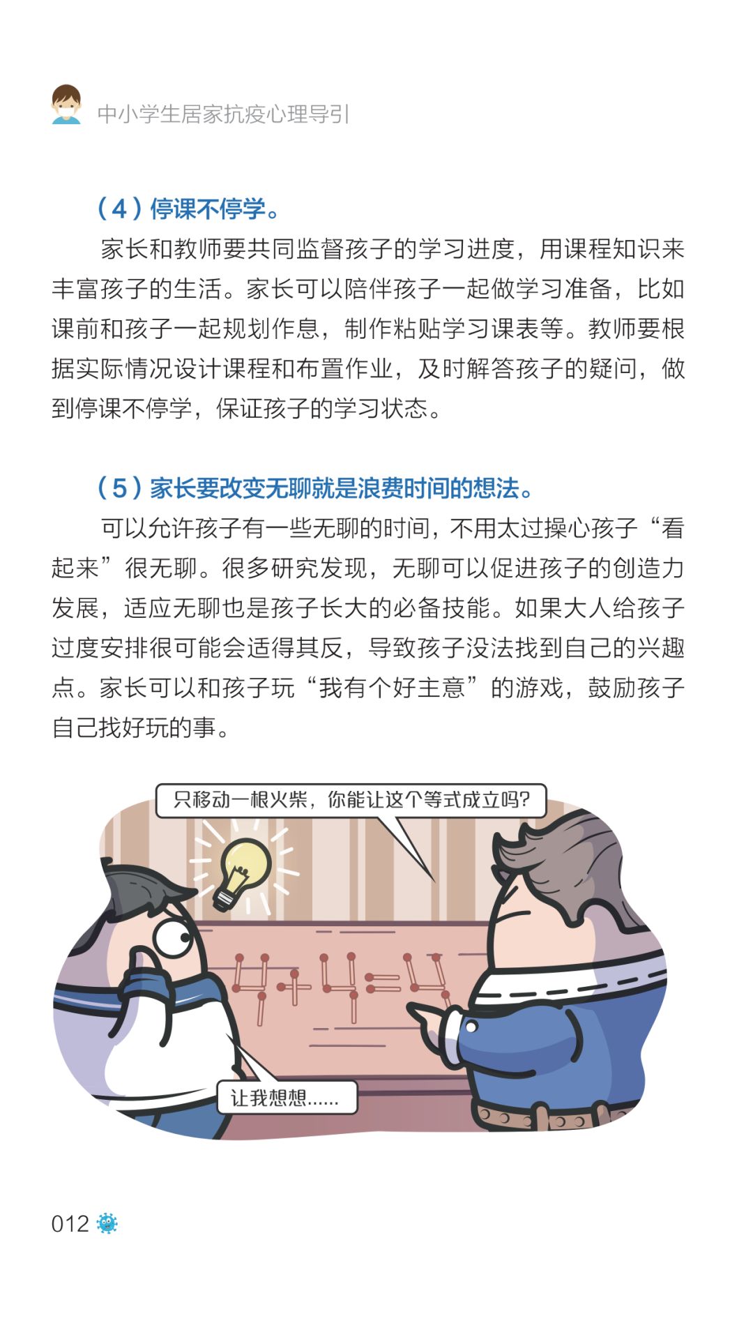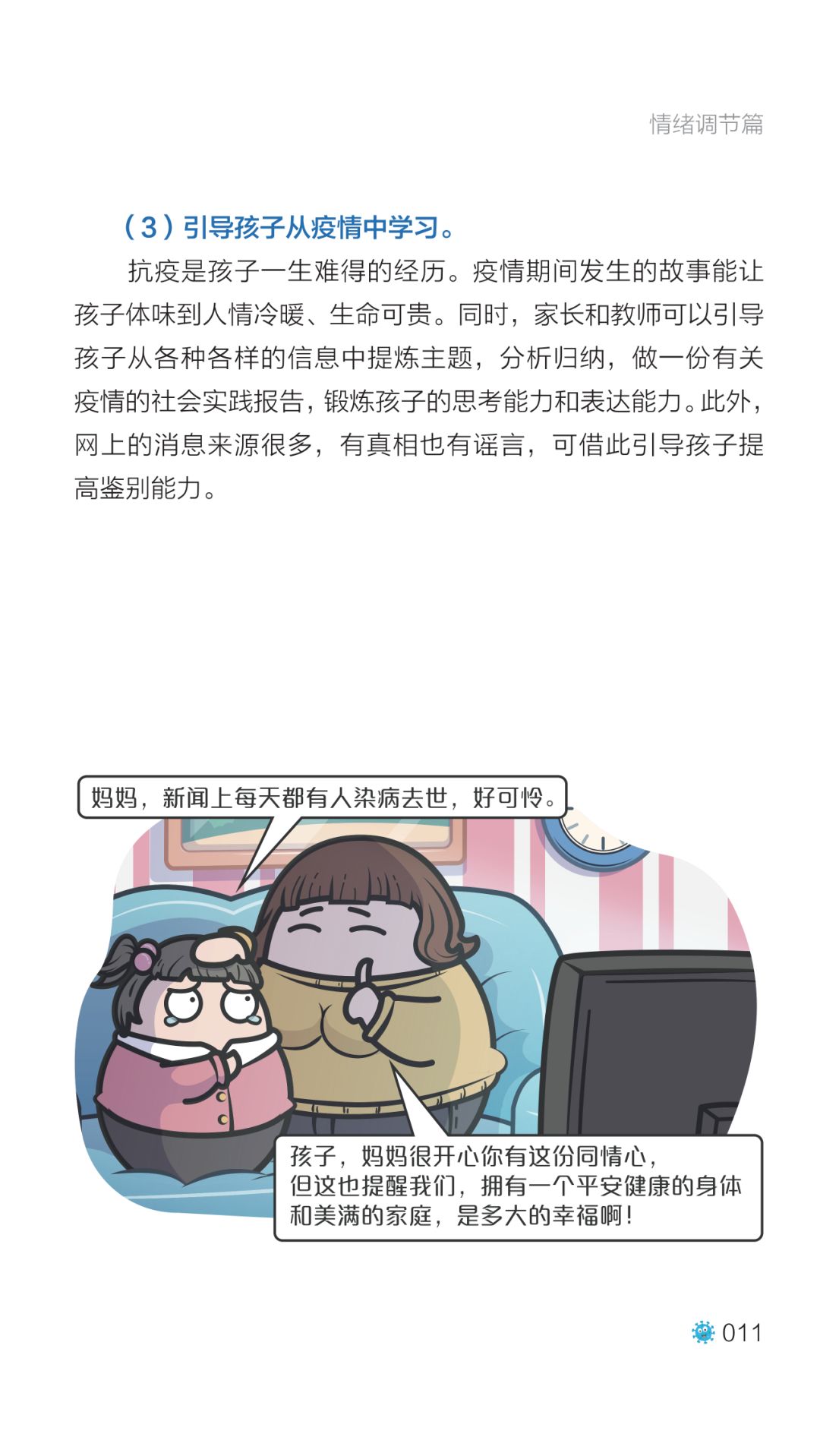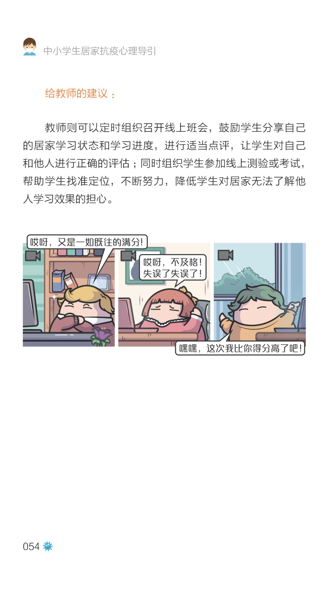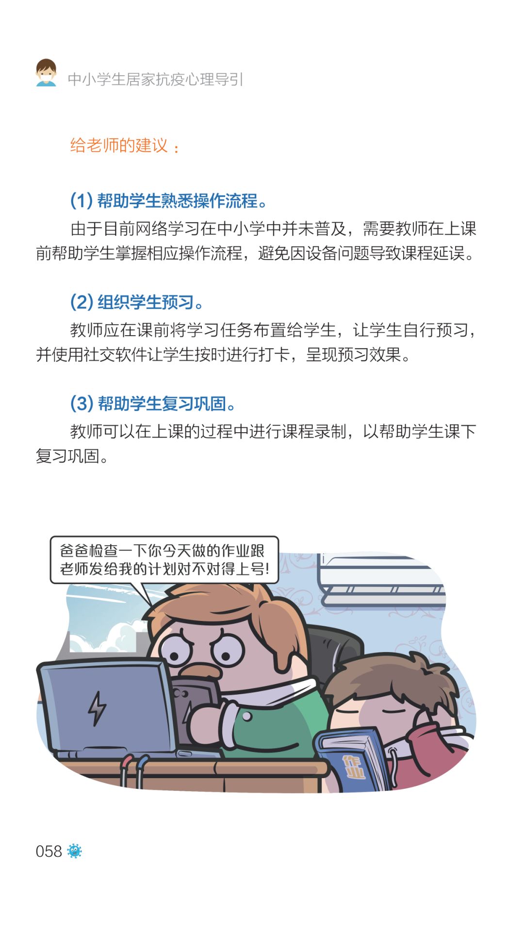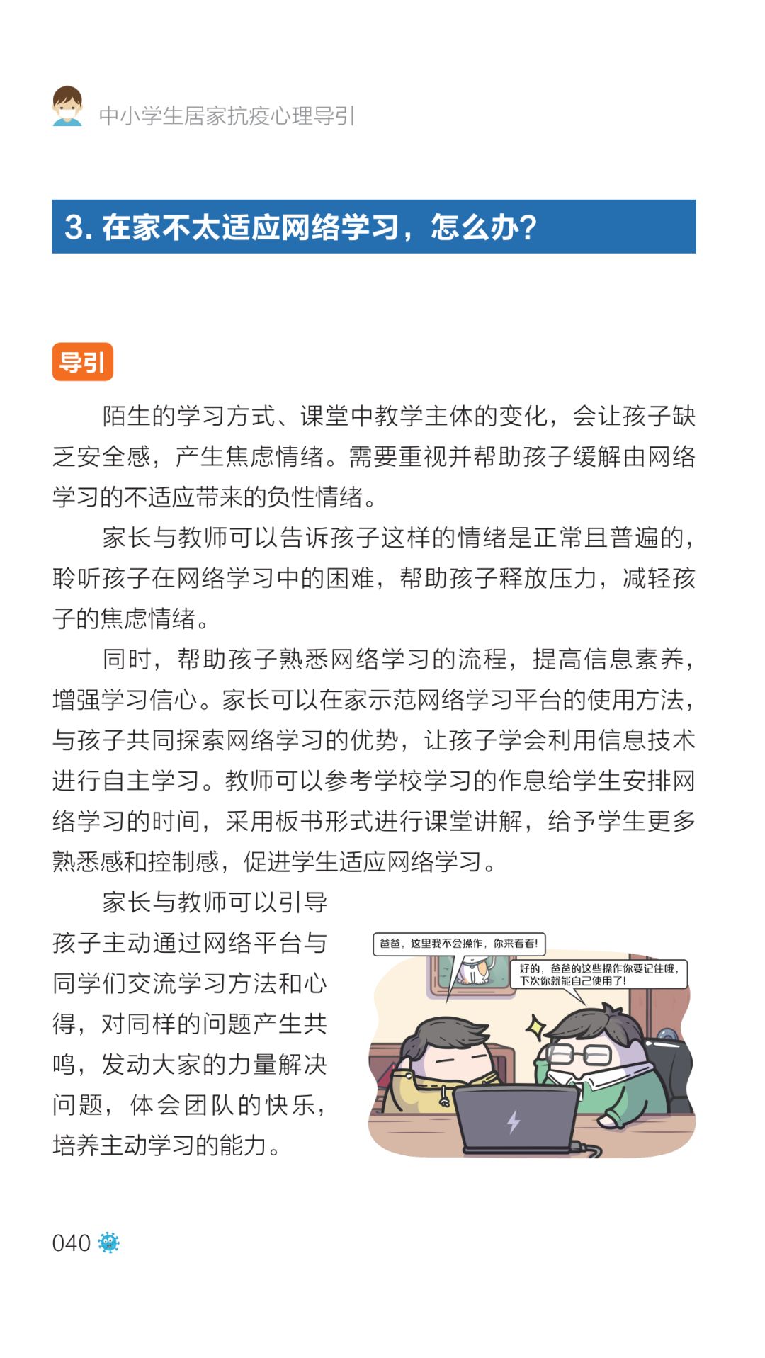 当他们面对大量有关疫情的信息无从分辨时,会感到恐惧和焦虑;当他们因疫情不得不长期居家难见朋友时,会感到拘束和烦闷;当他们因家人投入一线抗疫工作无法合家团圆时,会感到担忧和孤独;而在中小学全面开展在线教育时,他们更是面临着全新的挑战。