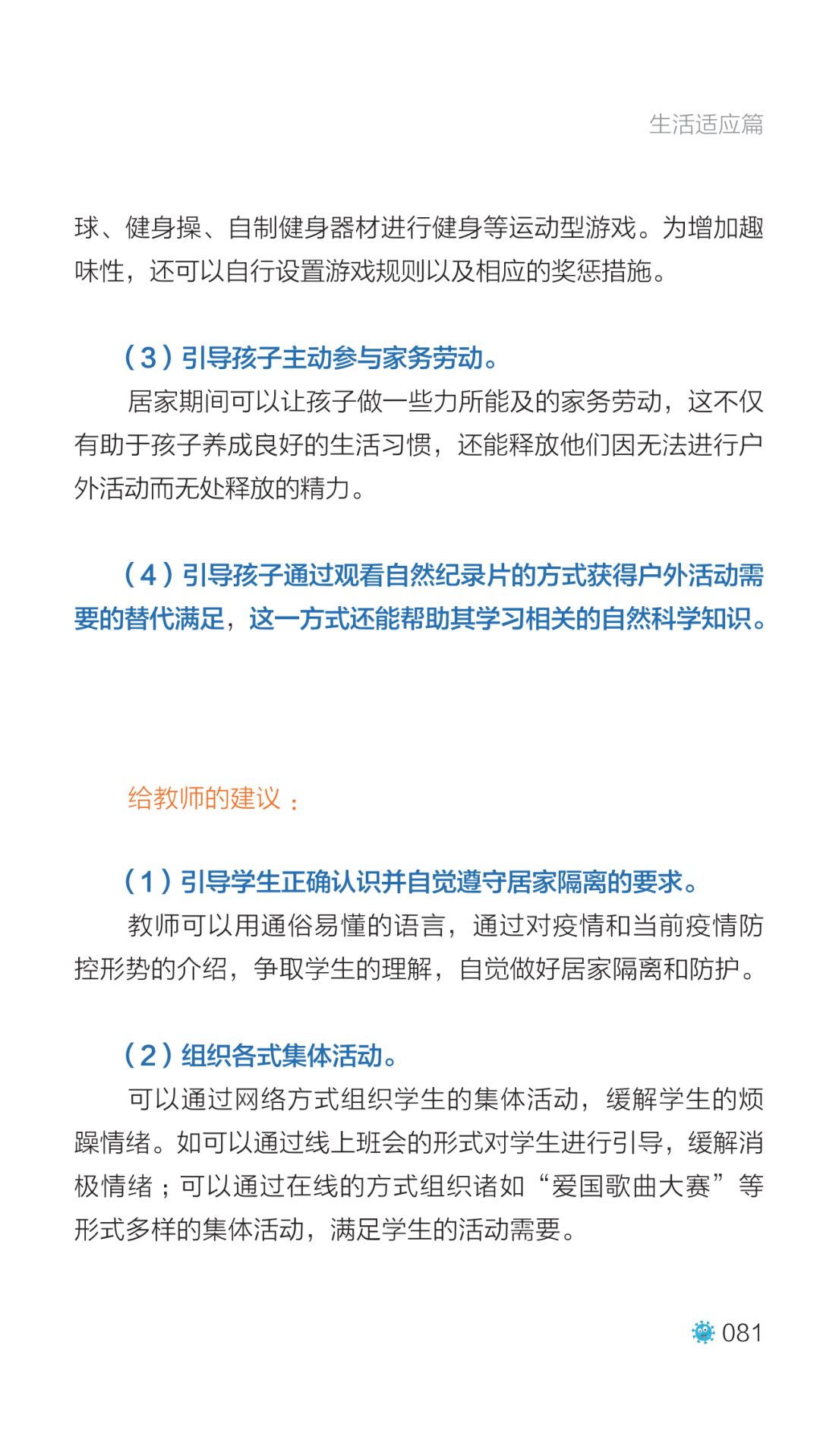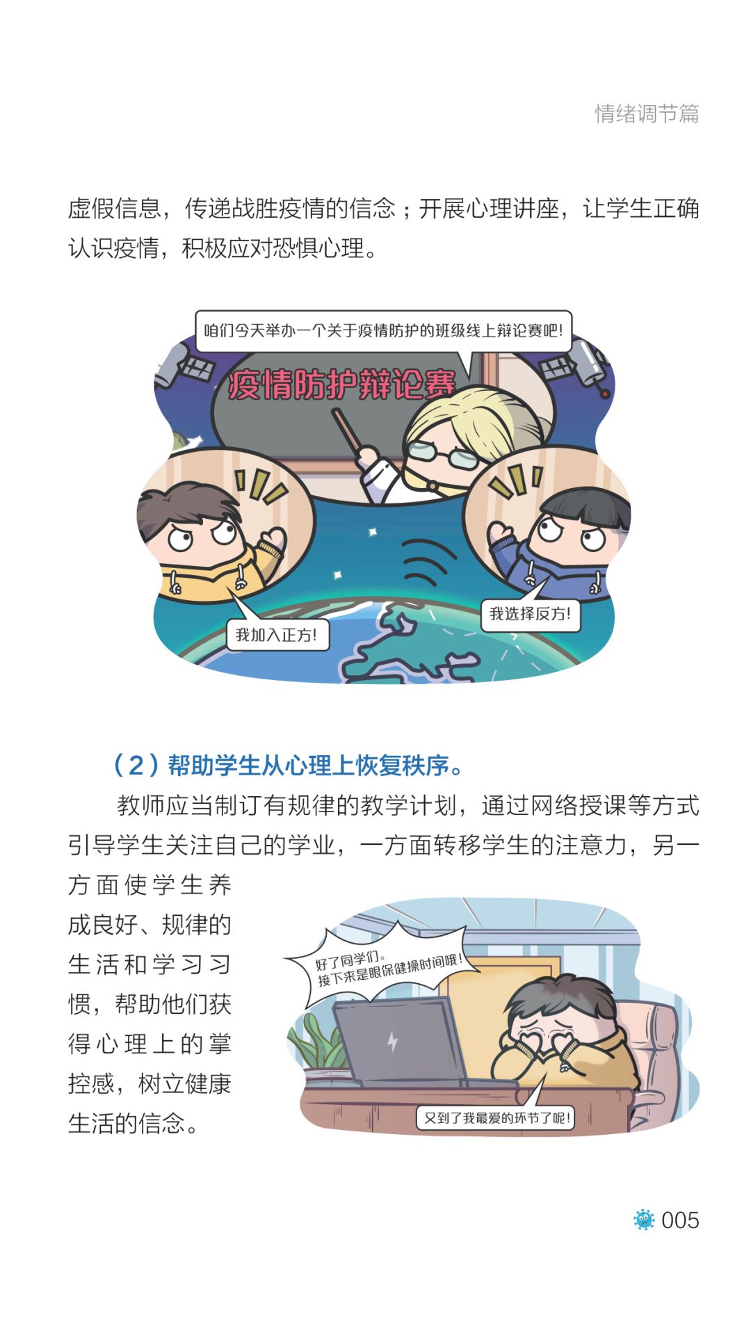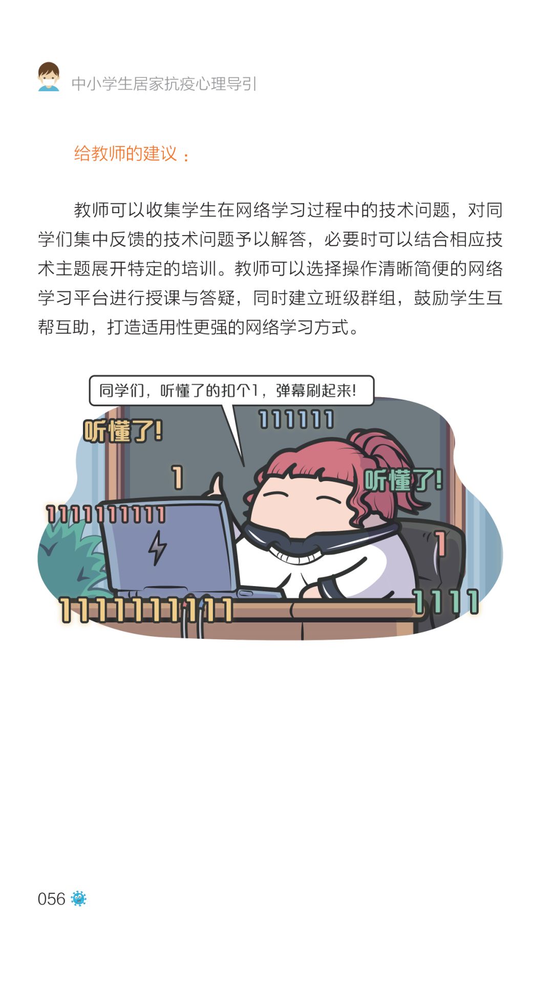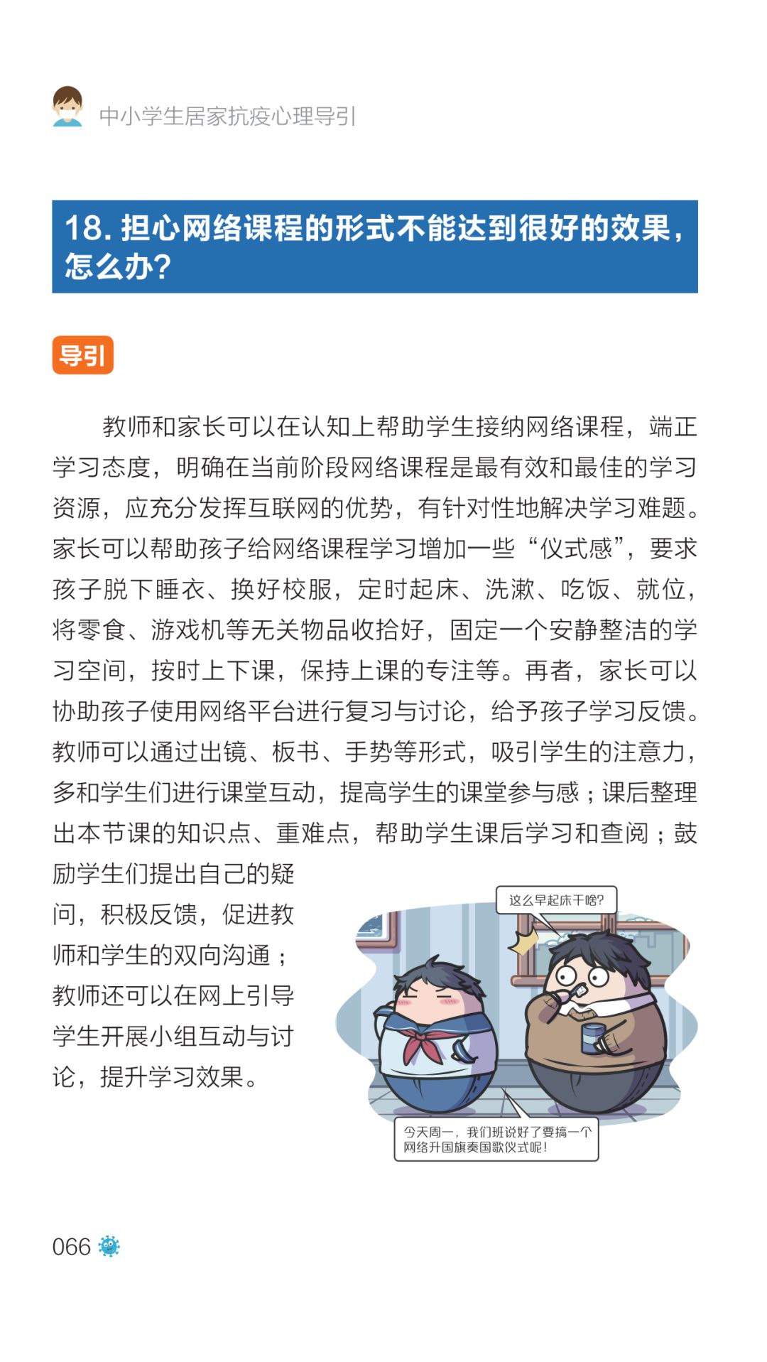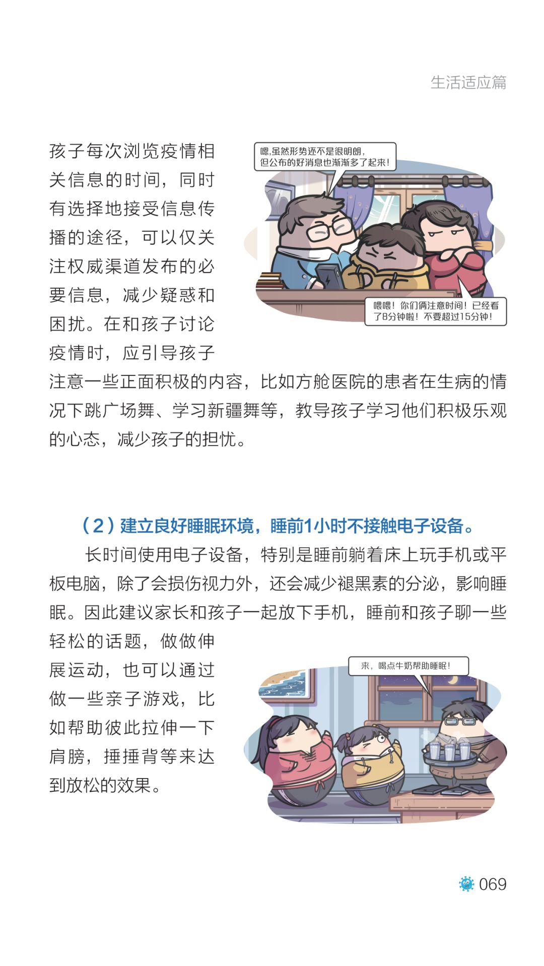 当他们面对大量有关疫情的信息无从分辨时,会感到恐惧和焦虑;当他们因疫情不得不长期居家难见朋友时,会感到拘束和烦闷;当他们因家人投入一线抗疫工作无法合家团圆时,会感到担忧和孤独;而在中小学全面开展在线教育时,他们更是面临着全新的挑战。