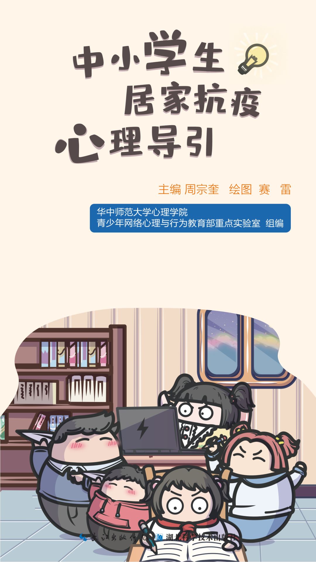 为了帮助广大青少年缓解心理压力,在教育部中小学心理健康教育专家指导委员会指导下,专委会委员周宗奎教授领衔华中师范大学心理学院和青少年网络心理与行为教育部重点实验室的多位专家教授,策划编写了《中小学生居家抗疫心理导引》一书。目前,以该创作团队为核心成员的教育部华中师范大学心理援助热线平台也已公开发布,同“心”战“疫”,携手前行!