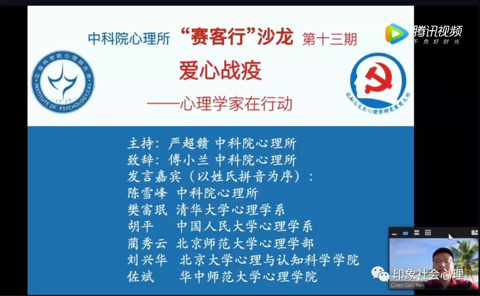2020年5月21日下午,中国科学院心理研究所第十三期“赛客行”沙龙以线上会议与网络直播的形式成功举办。本次沙龙主题为“爱心战疫——心理学家在行动”,特别邀请了中科院心理所、清华大学、中国人民大学、北京师范大学、北京大学与华中师范大学六所高校的心理领域专家学者进行报告。湖北省心理学会会长、华中师范大学心理学院佐斌教授受邀,对疫情发生以来华中师范大学心理学院及湖北省心理学同仁开展的抗疫工作进行了报告与交流。会议由中国科学院认知与发展心理学研究室党支部书记严超赣主持,中科院心理所所长傅小兰致辞。