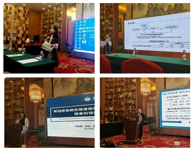 在社会认知主题会场,参会心理学院师生进行了精彩报告与交流。温芳芳副教授以“‘性别刻板印象对人不对己’:女性潜能偏好的评价者-行动者双视角检验”为题,报告了从评价者与行动者视角对女性潜力评价的研究成果。博士生谢志杰以“潜能是把双刃剑:调节定向对潜能评价的影响”为题探索了人事决策情境下调节定向对潜能评价的调节作用;博士生海曼报告了以“工作不安全感对网络闲逛的影响:自发走神与任务重塑的作用”为题的研究;硕士生叶含雪报告了以“新冠疫情期间旁观者群际歧视内归因倾向对指向歧视者的情绪与行为的影响”为题的研究发现;硕士生柯文林以“对热情更‘严格’,对能力更‘包容’?面孔热情能力水平对面孔感知的影响”为题报告了疫情期间个体对面孔热情与能力的感知特点。报告期间,参会人员与我院报告人积极问答互动,与会师生感到受益匪浅,收获满满。