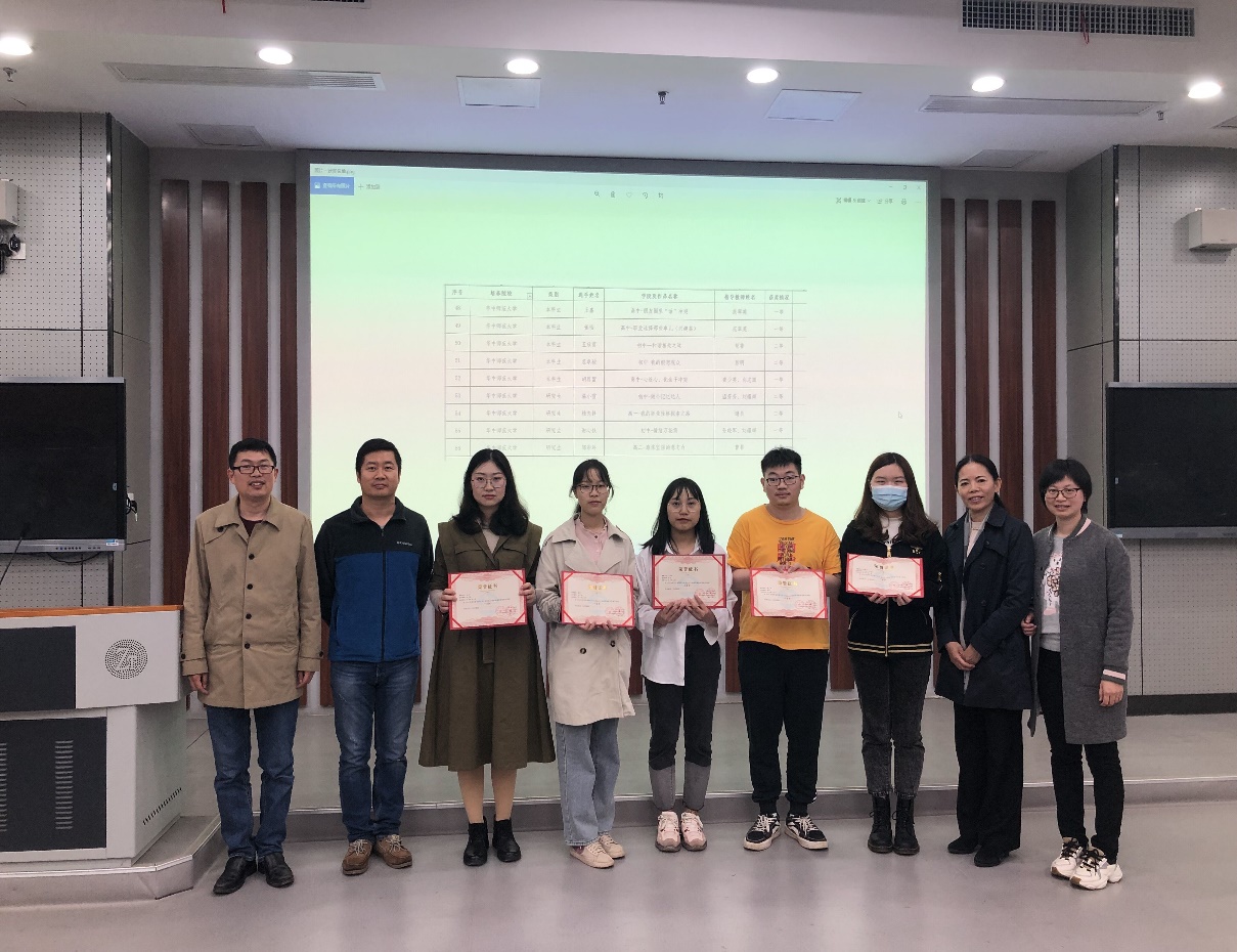 随后,为获奖的同学颁奖。本次竞赛共有九名同学获奖,其中胡雅蕾、董怡、王嘉同学获得本科生组一等奖,裘卓骏、卫新雨同学获得本科生组二等奖;谢心仪同学获得研究生组一等奖,桂先锋、温小雪同学获得研究生组二等奖,邹彩玲同学获得研究生组三等奖。