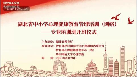 8月28日上午9:00,湖北省中小学心理健康教育管理培训班的开班仪式在线上顺利举行。本次培训班由湖北省教育厅主办,教育厅基础教育处指导并组织,教育部华中师范大学心理援助热线平台暨教育部心理健康援助中心(筹)、华中师范大学心理学院联合承办。培训班特邀了一批中小学心理健康教育及危机干预领域的知名专家学者授课,共有1300多名来自全省各市(州)、县(市区)教育局分管领导、职能科室负责人以及中小学校长、心理健康教育骨干教师、教研员分别参加管理班和专业班的学习。