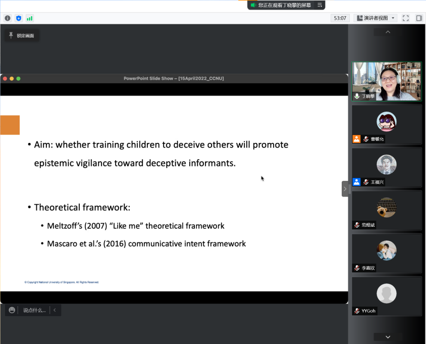本次讲坛邀请到的主讲人是新加坡国立大学心理学系的助理教授丁晓攀教授。主持人王福兴教授为线上参会师生隆重介绍了丁晓攀教授,并对丁晓攀教授表示了热烈的欢迎。报告期间,丁晓攀教授向线上师生介绍了团队有关儿童早期学会“欺骗”行为的三项研究——“儿童自己是否会说谎?”、“学会说谎对认知的好处”以及“学会说谎带来的社会技能的提高”。丁教授用幽默风趣的语言向在线师生解释了为什么需要儿童学会说谎和欺骗以及开展这一研究的实际应用价值。通过“策略性说谎”的游戏训练可以提高儿童的知觉警觉性,从而对坏人说不,减少诱拐事件的发生。同时,在网络信息爆炸的当代,通过这样的训练也可以帮助儿童辨别网络上哪些信息是对的,值得相信的,哪些信息是错的,是不能相信的。