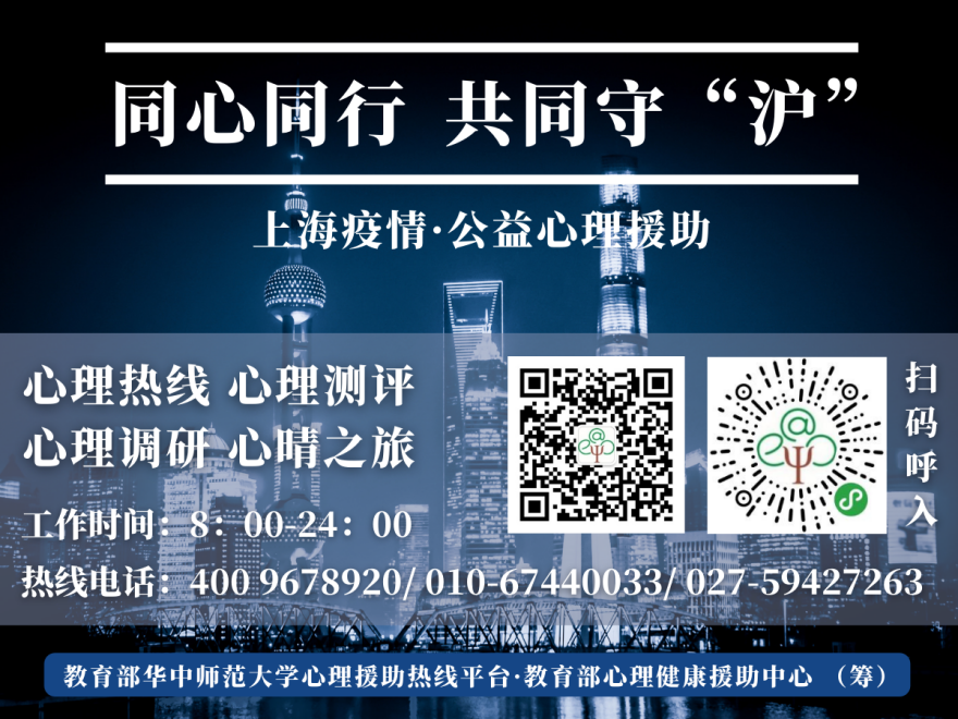 自上海疫情以来,奔走前线的工作人员、志愿者,居家隔离的群众,每个人都承受着巨大的身心压力。为了守护人民心理健康,教育部华中师范大学心理援助热线平台持续支援,面向上海等疫情严重区域提供心理援助热线服务。让我们共克时艰,携手走过这段疫情防控岁月。
