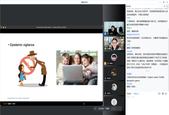 2022年4月12日、4月29日,由华中师范大学心理学院主办,心理学院研究生会协办的“迎校庆120周年逐梦者讲坛”第二讲、第三讲分别开讲。第二讲的主讲人是新加坡国立大学心理学系的助理教授丁晓攀老师,会议由王福兴教授主持。丁晓攀向线上师生介绍了团队有关儿童早期学会“欺骗”行为的三项研究——“儿童自己是否会说谎?”“学会说谎对认知的好处”,以及“学会说谎带来的社会技能的提高”。第三讲的主讲人是西南大学何清华教授,会议由贺金波教授主持。何教授以脑岛及其亚区结构和功能在成瘾中的重要作用为题,与在线师生进行了分享,介绍了该课题组新近的一些成果介绍脑岛在物质成瘾和行为成瘾中的作用,以及与其他大脑系统的相互作用机制。