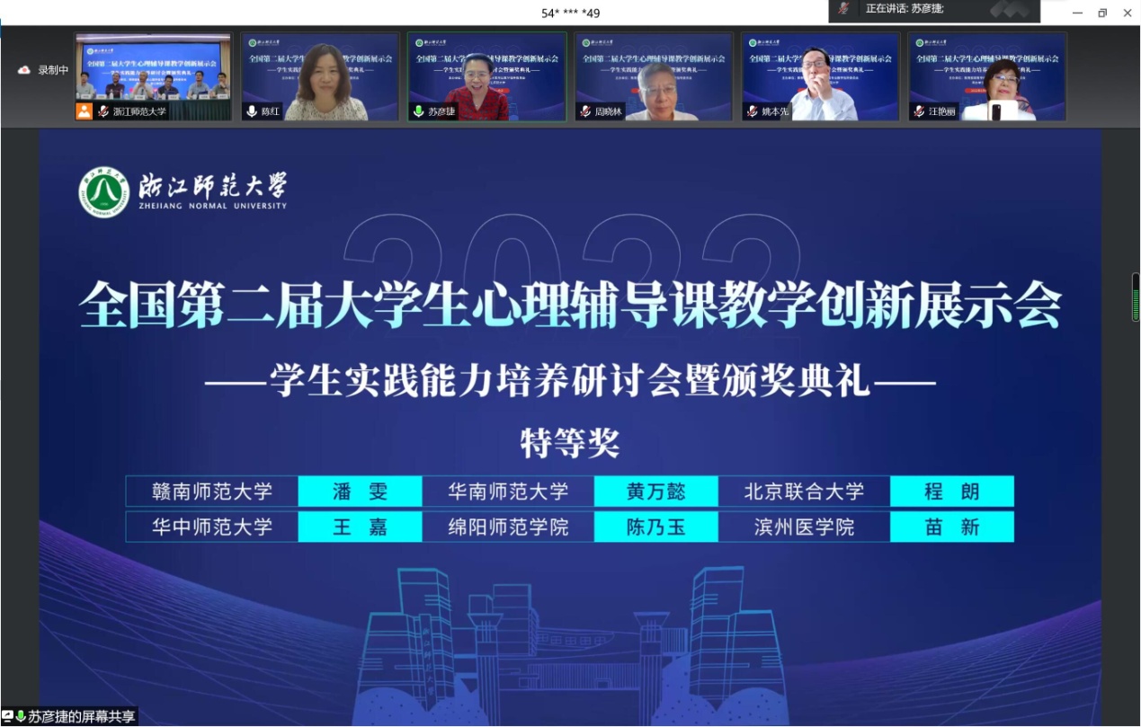 2022年6月6日下午,全国第二届大学生心理辅导课教学创新展示会——学生实践能力培养研讨会暨颁奖典礼在线上举行。我院心理学(师范)专业学生王嘉获得此次大赛的全国特等奖。