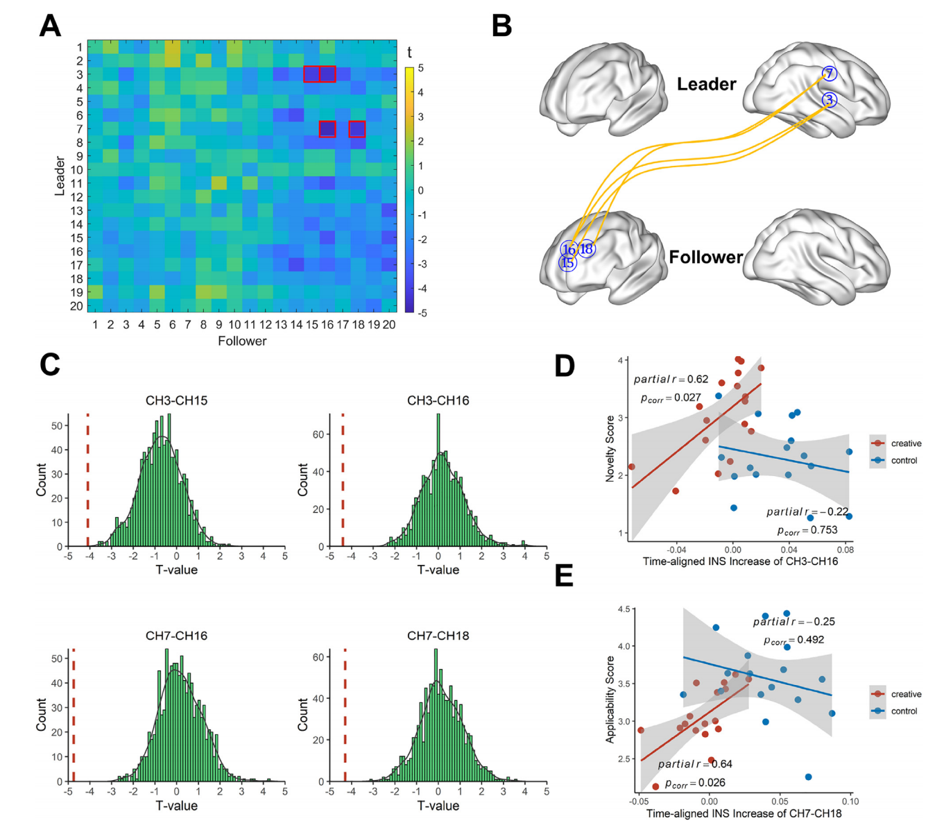 该研究发现在团体创造过程中,个体在行为与神经活动上均表现出了领导者-追随者角色分化的现象。且相比于一般任务,在团体创造中领导者右侧颞顶联合区与追随者左侧背外侧前额叶的人际神经活动耦合较差,这可能与成员在创造活动中难以对方案或意图形成共同理解、表征及观点冲突有关。然而,当个体间INS增强时,创造性任务的绩效会得到提高,这可能意味着高绩效团队更好地整合创新观点并达成了共同理解、意图和目标。此外,不同脑区的INS动态存在差异,与团体创造新颖性有关的INS在任务早期阶段下降,而与适用性有关的INS在任务中期阶段下降,这可能与创造过程特点有关。该发现揭示了自然交流背景下团体创造的独特人际神经模式。