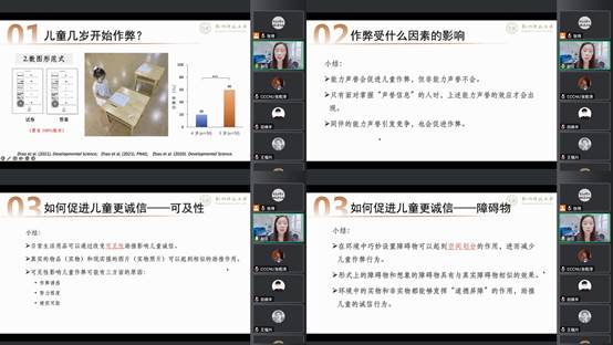 紧接着赵立教授介绍了团队在这一领域的一系列研究,这些研究主要围绕三个问题进行展开:1、儿童几岁开始作弊;2、作弊受什么因素的影响;3、如何促进儿童诚信、减少作弊。赵立教授在报告过程中层层递进,逻辑缜密,同时用生活中的例子帮助大家理解,从问题提出到得出结论,深入浅出,让大家对儿童的作弊行为从产生到干预有了清晰的认识。