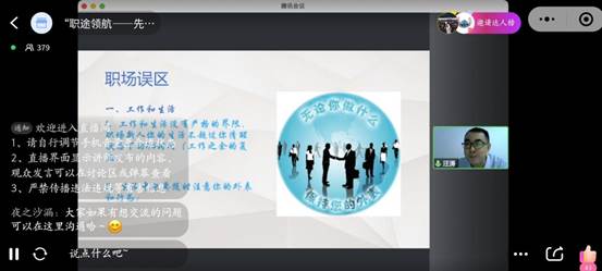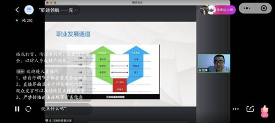 11月6日晚7:00,华中师范大学心理学院 “职途领航——先行者讲坛”系列分享活动第二期顺利开展。本次活动主题是:职场小白的进阶要诀,主讲人是心理学院校友汪涛,工作过高德红外、合建卡特、广信科教集团等上市公司和大型集团化公司,现任湖北斯诺新材料科技有限公司任人事行政总监。活动以直播的形式展开,由心理学院辅导员任嘉航主持。