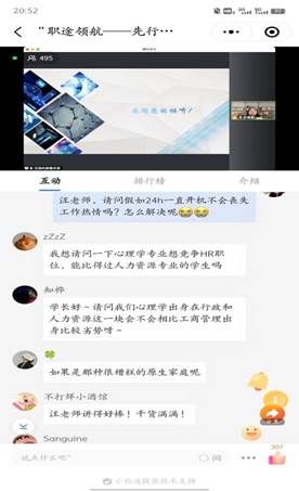 在答疑互动环节,在线师生与汪涛就“心理学专业在竞争HR职位时能否比得过人力资源专业的学生”等问题展开了热烈的探讨。汪涛表明专业只是敲门砖,而现在的企业更需要的是综合型人才。他鼓励同学们在学习中多思考,在课余时间多实践,不断提高自己的专业知识和实干能力,为今后的求职简历增加一些闪光点。