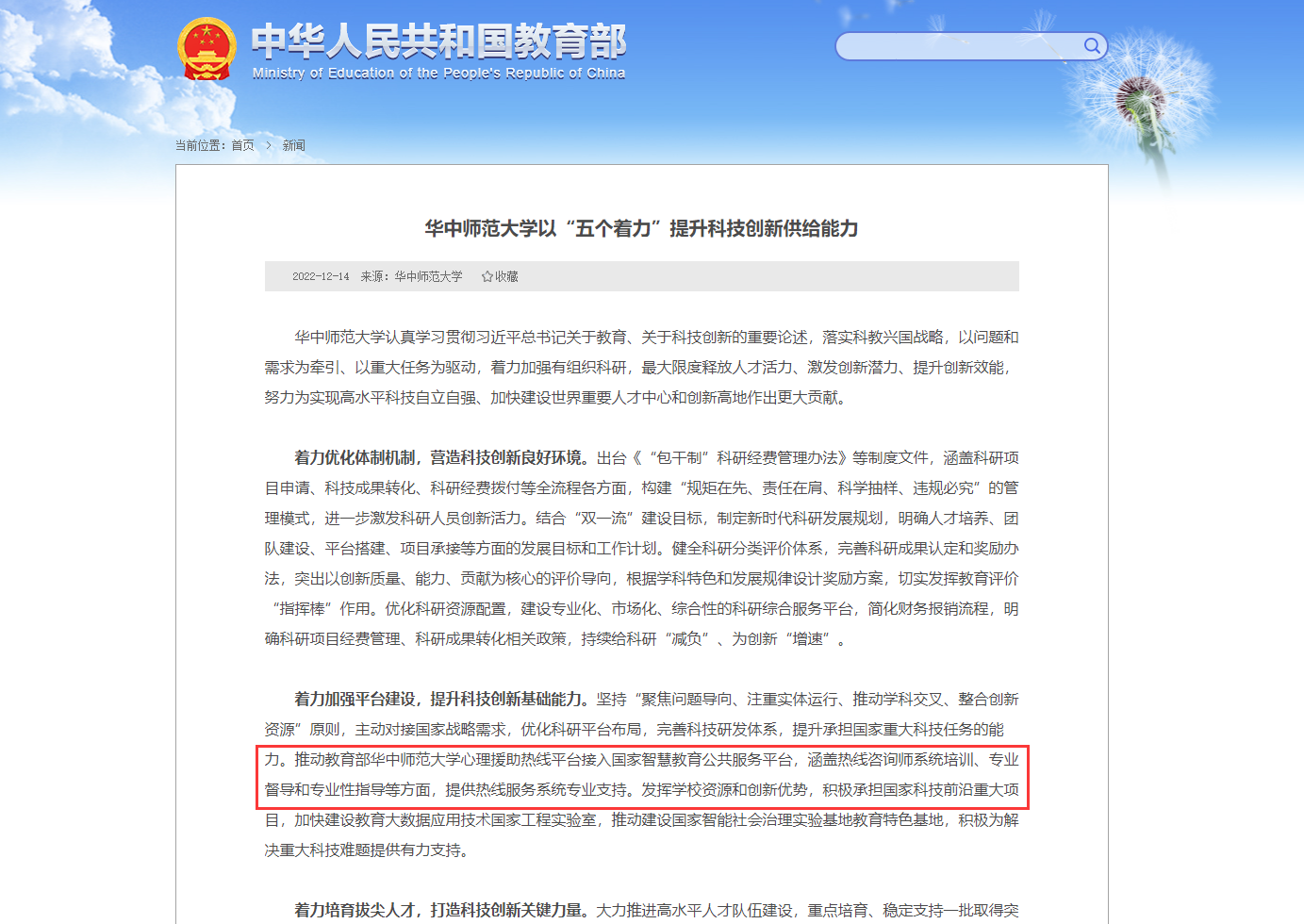 12月14日,教育部官网《战线联播》栏目以“华中师范大学以‘五个着力’提升科技创新供给能力”为题,报道我院主动对接国家战略需求,推动教育部华中师范大学心理援助热线平台接入国家智慧教育公共服务平台,涵盖热线咨询师系统培训、专业督导和专业性指导等方面,提供热线服务系统专业支持。