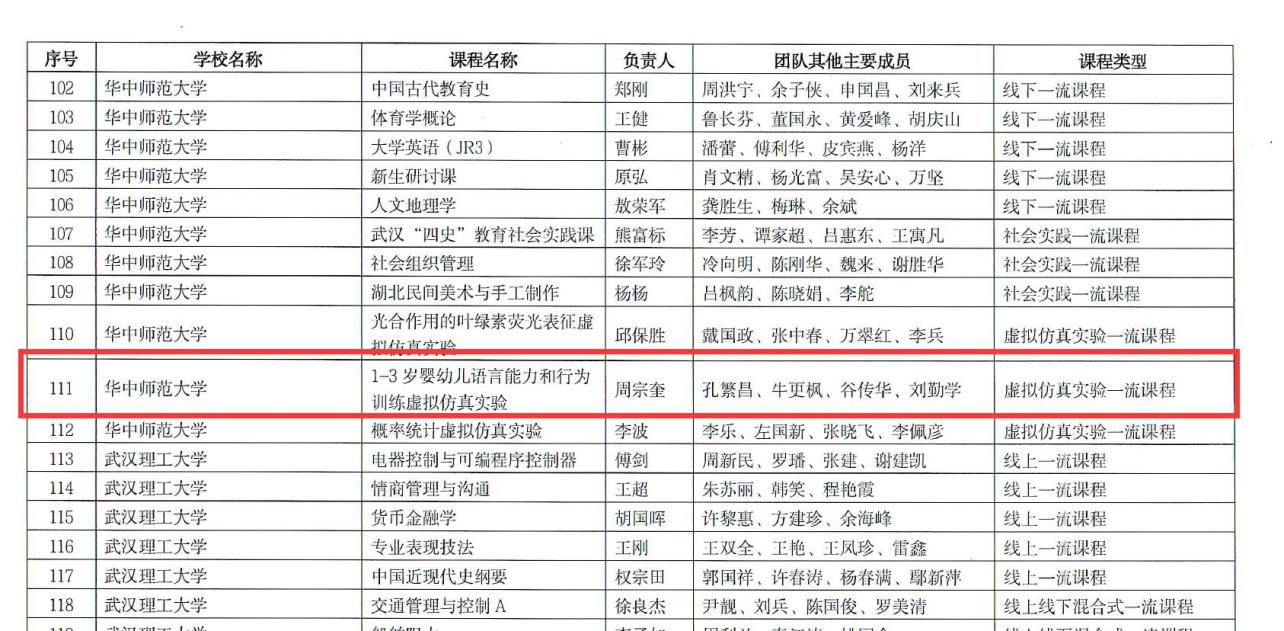 近日,鄂教高函[2022]16号《省教育厅关于公布2022年度升级一流本科课程认定结果的通知》发布,我院周宗奎教授主持的《1-3岁婴幼儿语言能力和行为训练虚拟仿真实验》获批为湖北省级一流本科课程(虚拟仿真实验教学类)。