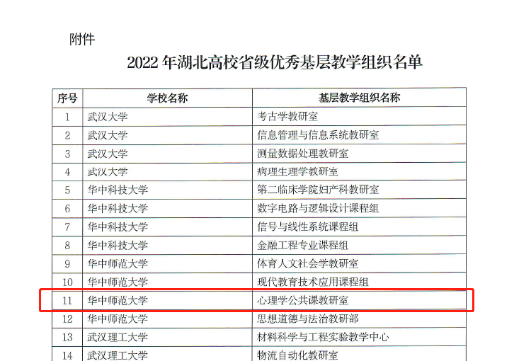 12月6日,湖北省教育厅下发了《省教育厅关于公布2022年湖北高校省级优秀基层教学组织的名单》(鄂教高函[2022]17号)文件,我院“心理学公共课教研室”荣获省级优秀基层教学组织。