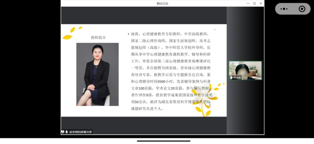 11月25日晚7:00,华中师范大学心理学院 “职途领航——先行者讲坛”系列分享活动第六期顺利开展。本次活动主题是:高中心理健康教育课程设计与实施,由心理学院优秀校友凌霄主讲,心理学院范翠英教授主持。凌霄从心理健康教育的目的,高中心理健康教育课的主要内容以及实际课程教案几个方面向参会师生分享高中心理健康课程如何设计与实施。最后,主持人范翠英教授对此次分享活动进行总结,再次对凌霄的精彩分享表示感谢,也希望同学们努力提升自己的教学能力,为自己以后进入学校进行心理健康教育工作做好充分的准备。