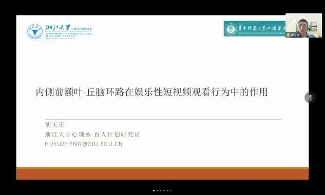 会上主持人刘威代表学院对胡玉正教授的到来表示热烈欢迎,并对胡老师做出介绍,鼓励学生主动思考、积极提问。胡教授的研究先以小鼠建立动物模型,用光遗传技术特异性激活目标脑区,观察小鼠行为模式和脑功能成像,并在此基础上以人为研究对象进行短视频成瘾行为的转化研究,结果揭示了"内侧前额叶-丘脑-腹侧被盖"通路在情绪动机乃至行为成瘾的重要作用,为理解心境障碍、成瘾等相关的社会、教育、心理健康问题提供启发性的思路。