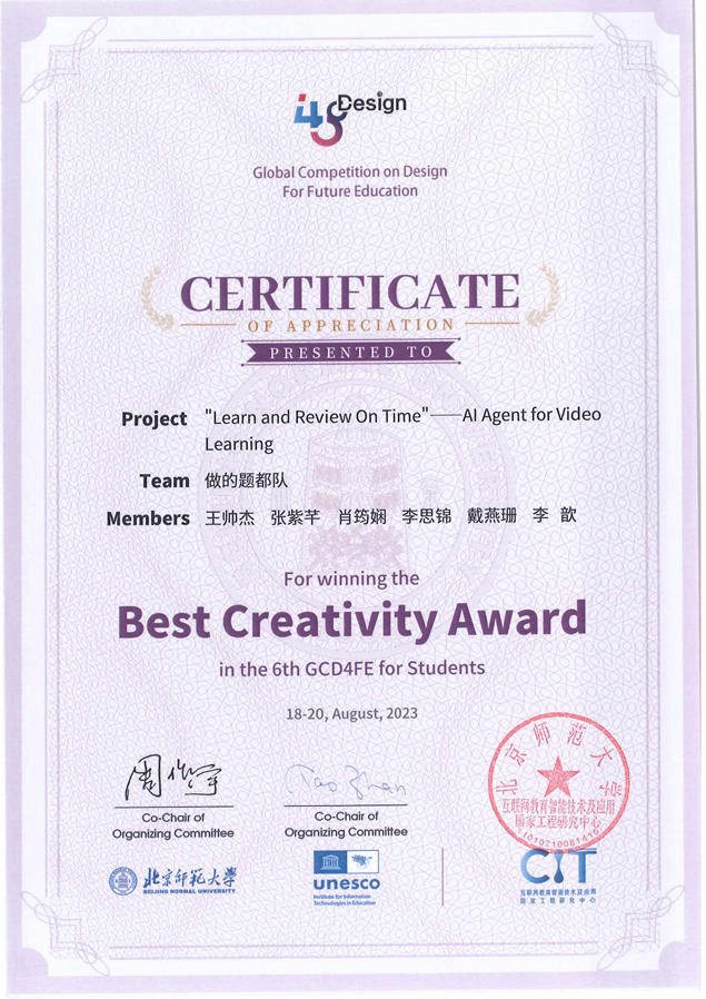 王帅杰同学的项目“Learn and Review On Time”——AI Agent for Video Learning“旨在借助人工智能技术,突破视频学习的局限性,为学生提供一个更具结构化和导航性的学习环境。当前,视频学习存在着内容选择困难、学习结构不清晰等问题,严重制约了学生的学习效果和动力。因此,“做的题都队”团队致力于通过智能导航目录、AI学习助教和智能总结复习等创新功能,帮助学生更加轻松地选择、理解和消化视频学习材料,提升学习效果和体验。项目的目标是通过这些创新手段,为学生打造一个更加高效、便捷和有趣的学习环境,激发他们的学习热情和潜力。