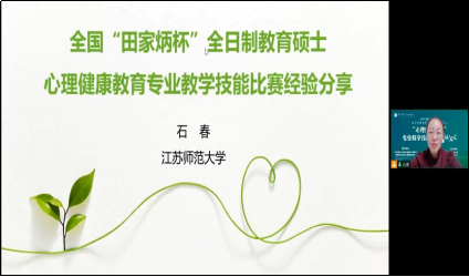 在经验分享环节,往届优秀作品指导教师,江苏师范大学石春老师进行了指导经验的交流。石老师分别对选题指导、教学设计指导和录课与模拟授课指导这三大板块内容进行了细致清楚的讲解。她指出心理健康老师备课在选题上要充分了解教材,通过逆向思维,来达到选题的新颖和有深度;在教学设计上要深耕教材并构建知识结构,同时通过巧妙设计一系列教学活动来促进学生对知识的理解;在录课和模拟指导上要优化自己的课件内容、教学要提供真实的情景,做到教学入“境”,以镜为“境”。