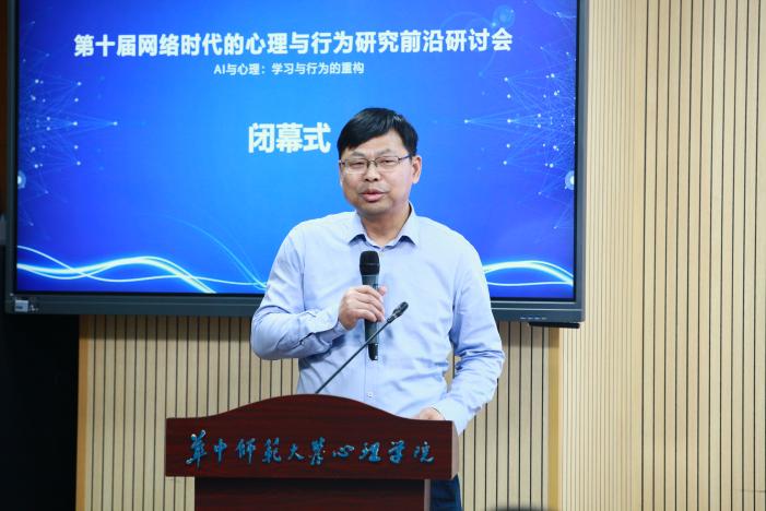在闭幕式致辞中,教育部重点实验室主任周宗奎教授对参会专家、老师和同学表达了由衷的感谢。他指出此次会议是一场跨学科和跨视角的交流盛会,面对人工智能等新技术的冲击,转危为机的重要途径是从多个视角出发,借助多学科的力量开展相关研究。利用人工智能展开学习工具与环境互动设计等问题,是当前心理学和其他领域研究和工作的题中之义,新时代的发展需要多学科多层面的集体智慧与创新。