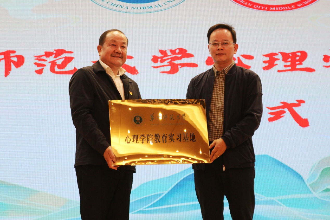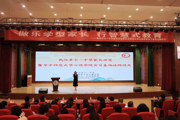 10月19日,华中师范大学心理学院教育实习基地授牌仪式在武汉市七一中学举行。江岸区教育局党委书记、局长高小健,少先队总辅导员凃晓莺,我校心理学院副院长孙晓军教授、田媛教授、彭明副教授,江岸区教育局办公室主任严涛、中教科分管科长蒋明国,武汉市七一中学校长吴时亮、党总支书记程端斌、分管校长彭云红,七一生态教联体联盟校部分教师代表以及七一中学九年级部分老师、家长代表参加了本次仪式。