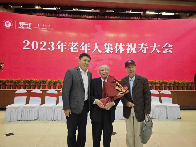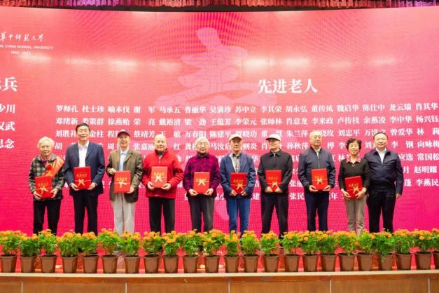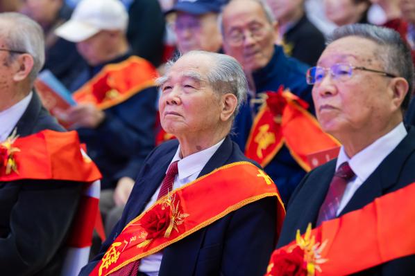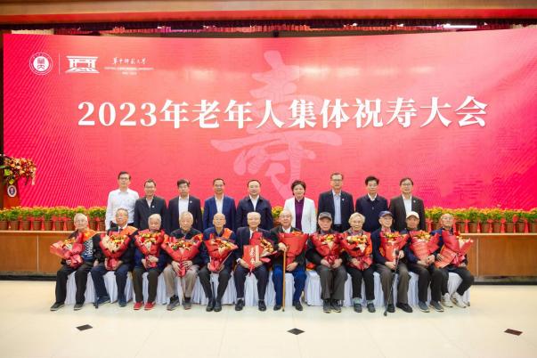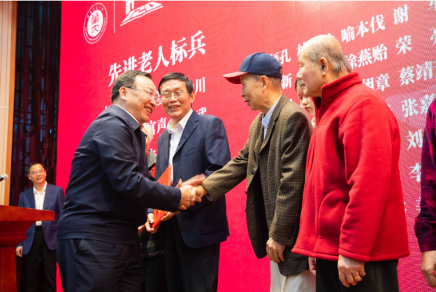 随后,校领导为年满90岁的寿星代表献花并合影留念。我院离退休教师中,年满90岁的有刘荣才和钟海云两位教师,刘荣才老师参加此次会议。他表示学校尊老、敬老、爱老、助老的工作温暖了老同志的心,也让老同志们分享到了学校改革发展的成果,祝愿学校在120周年校庆之际取得更大的成绩,也表达了珍惜当下美好生活,共同向百岁进军的美好愿望。