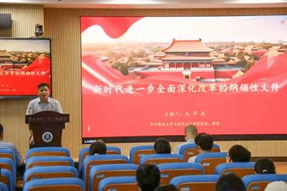 会议伊始,主持人马新华对本次会议进行了简要介绍,并隆重介绍了主讲人毛华兵。随后,毛华兵教授以《新时代进一步全面深化改革的纲领性文件》为主题,展开了深入浅出的宣讲。接着,毛华兵教授阐述了进一步深化改革的指导思想、总体目标和重要原则,从十三个方面细致讲解了进一步深化改革的重大举措