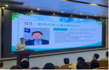 典礼第三项,教师代表王福兴教授发言。王老师以师长的身份表达了对新生的热烈欢迎和深切期待。他结合自己多年的教学科研经验,阐述了心理学的特有价值与时代使命,希望同学们能珍惜大学时光,既要深耕专业、锤炼品格,又要保持开阔的视野和深厚的人文关怀。