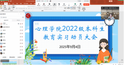 2025年9月4日下午15时30分,心理学院2022级教育实习动员大会通过线上腾讯会议平台顺利召开,心理学院副院长田媛教授、教育实习负责人彭明副教授、2022级教育实习指导老师温芳芳教授、成良副教授、李董平副教授、李旭副教授、蔡志慧副教授、郝鑫副教授、本科教学秘书杜宸宇老师和2022级全体师范生参加了此次会议,共同开启了2022级教育实习的崭新篇章。