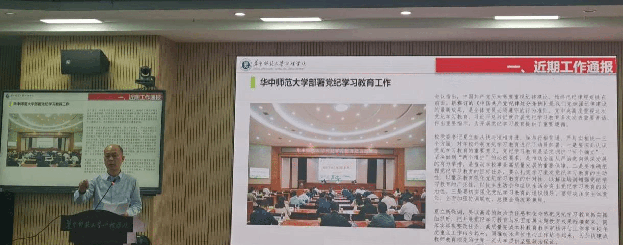 2024年04月19日下午,心理学院教工党支部在8060报告厅开展2024年03月和04月主题党日学习活动,学院党委书记马新华领学,教工支部全体党员参会。