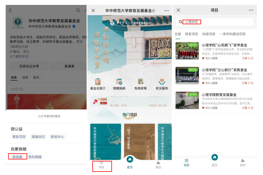 请有捐赠意向的校友可点击关注微信公众号“华中师范大学教育发展基金会”(方法一),点击“我要捐赠”-“微捐赠”,在“微捐赠”页面的“项目”版块搜索“心理学院教育发展基金”“‘心苑腾飞’奖学基金”“‘立心躬行’奖教基金”直接进行捐赠。