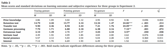 实验二进一步表明,无论是指向手势还是描摹手势,均优于“无手势”条件,这支持了多媒体学习中的信号原则和认知负荷理论,说明这两种手势都可以作为信号线索,帮助儿童聚焦关键信息,降低学习过程中的外在认知负荷,从而促进学习效果。其中,描摹手势的优势更加突出:相较于指向手势,描摹手势不仅带来更高的保持与迁移成绩,也更能促进儿童进行与学习内容相关的深层加工,这进一步支持了多媒体学习中的具身原则和认知负荷理论,即教学代理更多地运用身体动作(更具身化,或者说使用生物初级知识)能够更有效地辅助对抽象概念等生物次级知识的学习。