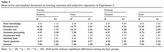 该研究为认知负荷理论以及多媒体学习中的信号原则和具身原则提供了新的儿童学习应用支持,也为中小学数字课程、科普视频及在线教学资源设计提供了有益启示。研究建议,若教学视频以静态插图为主,加入带有描摹手势的教学代理,往往更有利于促进儿童理解知识过程与内在联系;若视频本身包含必要的动态轨迹信息,则指向手势可以与动态呈现形成更好的配合。总体而言,面向儿童的视频设计不应一味追求“更炫的动态效果”,而更应追求手势、画面与讲解之间的恰当匹配。
