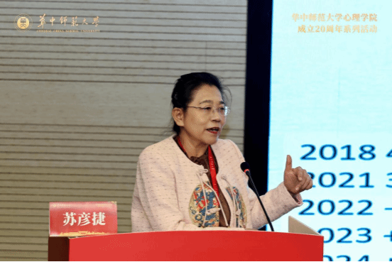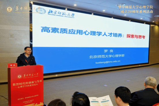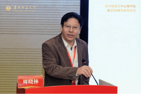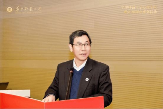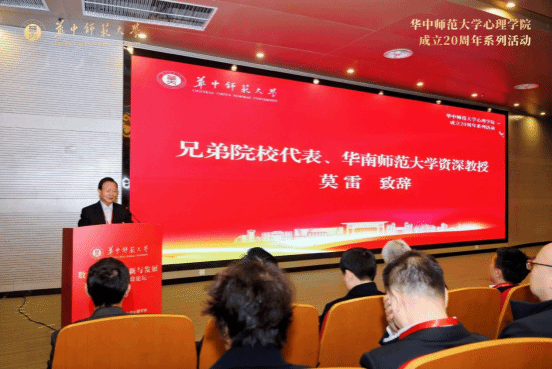 华南师范大学资深教授莫雷先生代表兄弟院校致辞,他将华中师大心理学院20年发展历程誉为“从艰难启程到乘风破浪的壮丽征程”。他特别指出我校心理学院在“人的发展与心理健康”和“青少年网络心理与行为”两大特色领域取得的成就,为全国心理学发展提供了重要借鉴。