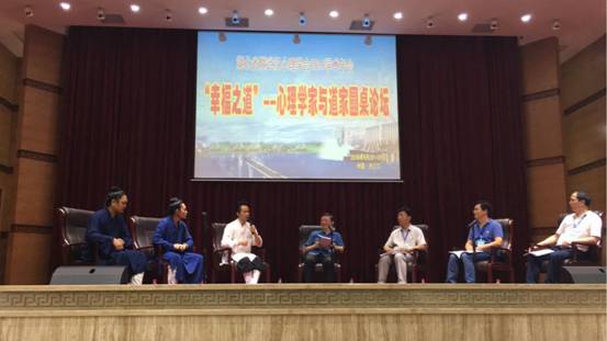 上午10时许,进行“幸福之道”——心理学家与道家圆桌论坛”,论坛由华中师范大学心理学院郭永玉教授主持,武汉大学哲学学院钟年教授、华中师范大学心理学院佐斌教授和华中科技大学龙立荣教授与三位道长进行了心理学家与道家的对话。对话开始于郭永玉教授抛出的第一个问题“道教与道家的关系”,三位道长和四位教授进行了积极地讨论。随着对“心理学与道教的联系”、“道家对人与自己内心的关系有什么启发?”“道家讲不争和无为是以度为基础的,这个度我们普通人怎么去把握?”等问题的深入探讨,心道对话进入高潮部分。最后心道对话结束于由钟年教授提出的问题“道家是我们本土的文化,如何捍卫我们自己的地位,如何应对其他宗教、其他文化的威胁?”。