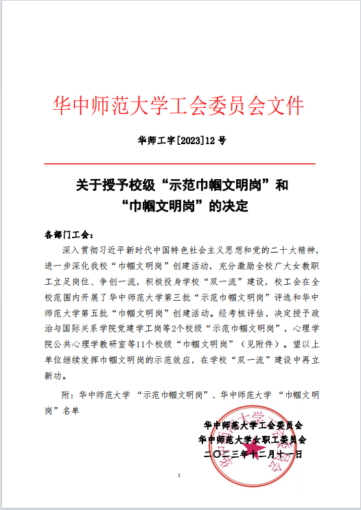 | 心理学院公共心理学教研室获评校级“巾帼文明岗”