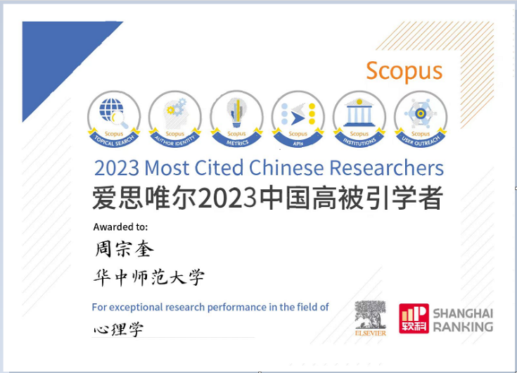 2024年3月27日,爱思唯尔(Elsevier) 正式发布2023“中国高被引学者” (Highly Cited Chinese Researchers)榜单。我院周宗奎教授荣登此榜单。