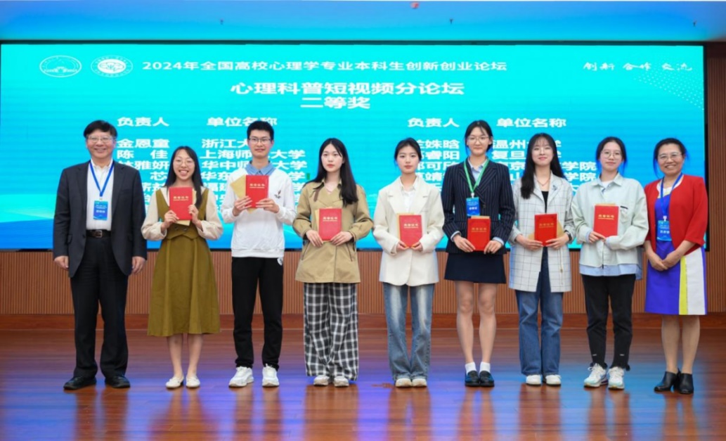 2024年5月2日,由教育部高等学校心理学类专业教学指导委员会主办,广西师范大学、心理学拔尖学生培养模式改革虚拟教研室承办的"2024年全国高校心理学专业本科生创新创业论坛"圆满落幕。在论坛初赛阶段,心理实验设计类73件,现实问题解决类122件,心理学产品设计类109件,心理科普视频类140件,我院学子在决赛阶段取得了1个一等奖、2个二等奖、1个三等奖的优异成绩。
