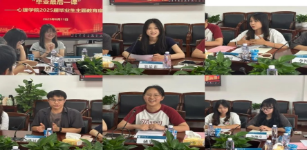 桂子山,南湖之畔,又到一年毕业季。6月11日,心理学院2025 届毕业生“毕业最后一课”主题教育活动在南湖综合楼8030 会议室举行。校党委副书记查道林,院党委书记连海江、党委副书记丁玉斌、研究生辅导员张婷、本科生辅导员温碧璇与研究生、本科生毕业生代表齐聚一堂,共话在桂子山的成长收获,畅谈未来发展。