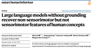 我院优秀校友徐启慧博士(2016届本科毕业生)近期在国际顶尖学术期刊《自然·人类行为》(2025年影响因子21.4)上以第一作者身份发表了题为《缺乏具身基础的大型语言模型能够还原人类概念中的非感知-运动特征,但无法还原感知-运动特征》(Large language models without grounding recover non-sensorimotor but not sensorimotor features of human concepts)的重要研究论文。该研究于2025年3月31日正式被接收。