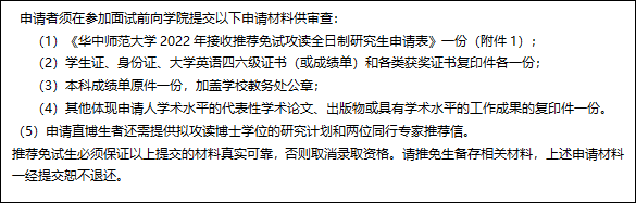 申请人登录“推免生预报名”系统(网址:http://yjs.ccnu.edu.cn/yjs/jump/tmsybm)进行预报名,提交报名信息,填写并上传《华中师范大学2022年接收推荐免试攻读全日制研究生申请表》(电子版)。特别说明:“推免生预报名”系统仅为服务我校推免生招生工作的辅助系统,主要用于前期征集报考志愿信息。按照教育部要求,所有推免生资格审核确认、报考、录取以及备案公开等相关工作均必须通过教育部“全国推荐优秀应届本科毕业生免试攻读研究生信息公开暨管理服务系统”进行(以下简称“推免服务系统”,网址:http://yz.chsi.com.cn/tm),否则无效。