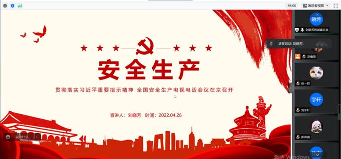 会议的第二部分由刘晓芳同志带领支部成员重温习近平总书记关于安全生产重要论述。生命安全重于泰山,习近平总书记高度重视安全生产工作,一再强调要统筹发展和安全。刘晓芳结合东航MU5735航空器飞行事故的事件背景,引出习近平总书记关于安全生产的重要指示,并结合事例对中央部署的15条强化安全生产责任落实、坚决防范遏制重特大事故的措施进行了详细的介绍,对其中出现的难以理解的名词进行了深入解读。党中央始终坚持人民至上、生命至上,坚决落实责任到位、措施到位,做好经济发展、疫情防控和安全生产工作。