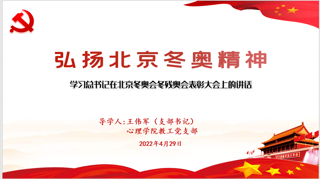王伟军同志首先带领全体党员深入学习习近平总书记在北京冬奥会冬残奥会总结表彰大会上的重要讲话。总书记充分肯定了北京冬奥会的巨大成就,总结了北京冬奥会的宝贵经验,并系统阐明了“胸怀大局、自信开放、迎难而上、追求卓越、共创未来”的冬奥精神,然后指出要管理好、运用好北京冬奥会遗产。支部党员纷纷表示要深刻认识和大力弘扬冬奥精神,充分发挥专业优势,守护师生身心健康,为奋进新征程,建功新时代贡献力量。