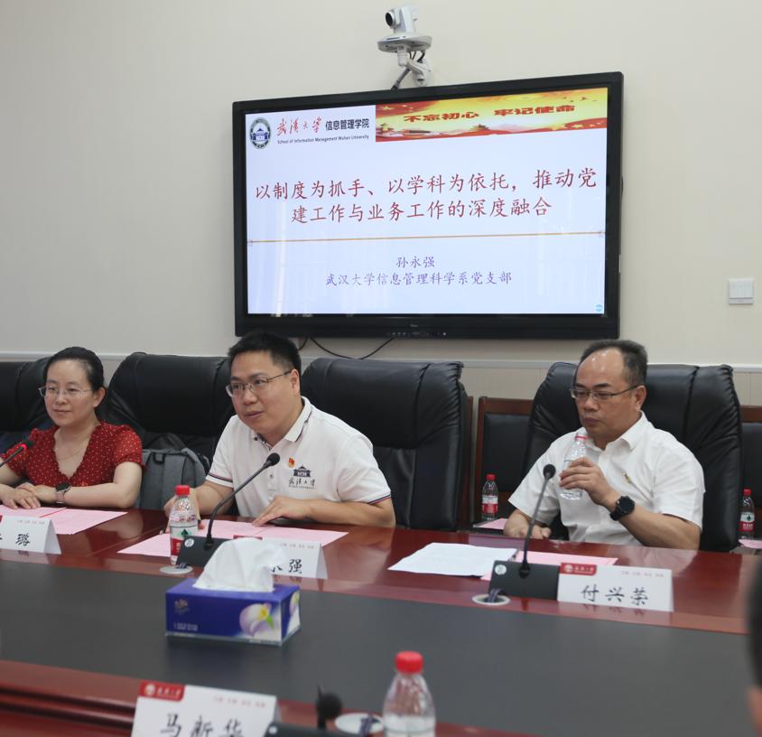 随后进入交流会第一阶段:支部建设经验交流。华中师范大学心理学院教工党支部书记王伟军和武汉大学信息管理科学系教师党支部书记孙永强分别介绍了所在支部的基本情况、创新举措和建设成果,并就筑牢支部战斗堡垒、发挥党员先锋模范作用以及党建业务双融双促等议题展开了深入交流。